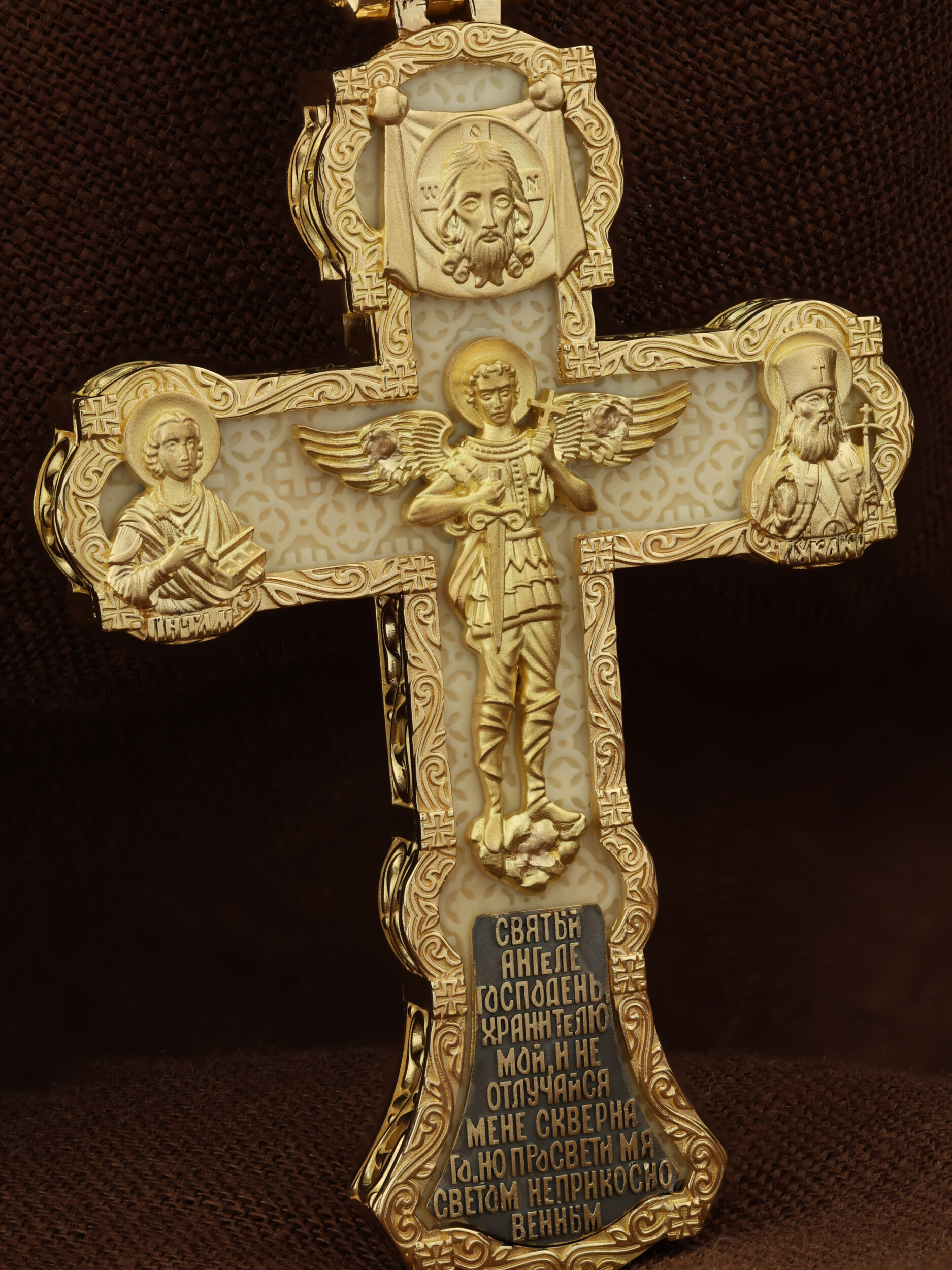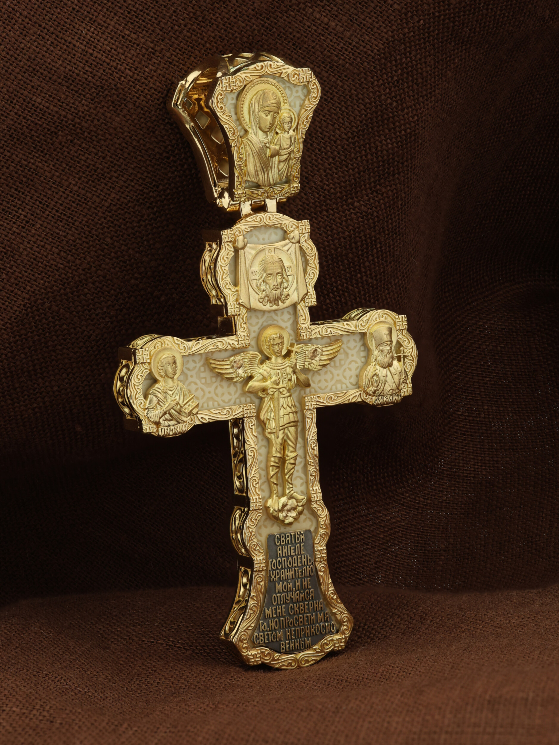 На центральной части оборотной стороны креста изображен Святой Ангел-Хранитель в виде прекрасного юноши держащего в правой руке крест, а в левой — мечь. Ангел-Хранитель — это Ангел приставляемый Богом к человеку при крещении для охраны и помощи в добрых делах. Невидимо пребывая при нас постоянно, он, руководствуя нас ко спасению, не только по нашему желанию таинственно наставляет нас на все доброе и полезное, не только возносит наши молитвы к Богу, но еще и сам от себя охраняют и защищают нас от врагов видимых и невидимых и ходатайствует за нас пред Богом. Ниже образа написана молитва: «Святый Ангеле Господень, Хранитель мой, не отлучайся мене скверного, но просвети мя светом неприкосновенным.» Выше образа изображен Спас Нерукотворный — образ Господа и Спасителя нашего Иисуса Христа, чудесно отпечатавшийся на плате, котором Христос вытер свой лик. Слева — Свя¬той ве¬ли¬ко¬му¬че¬ник и це¬ли¬тель Пан¬те-ле¬и¬мон. Господь даровал удивительную силу его молитве. Ею он исцелял любые болезни, воскрешал мертвых. Справа — Святитель Лука (Войно-Ясенецкий). На кулонном кольце изображена Казанская икона Божией Матери — одна из самых любимых на Руси.