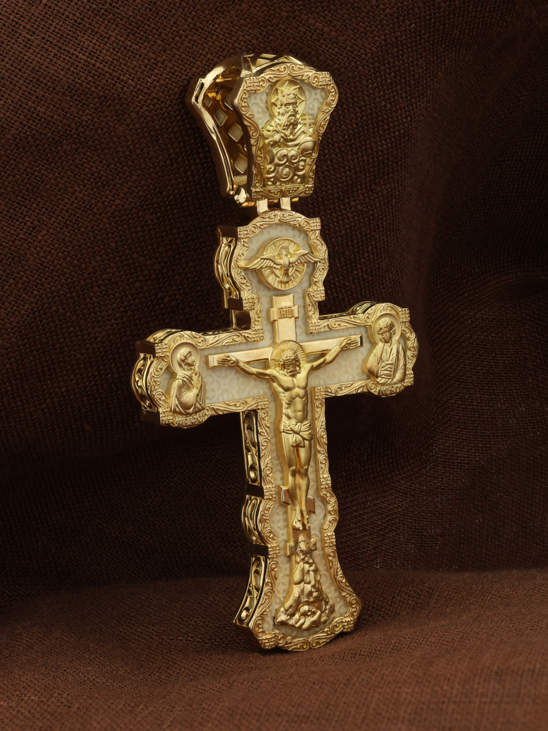 На лицевой стороне креста изображено Распятие Господа и Спасителя нашего Иисуса Христа. Христос, подвергнутый на кресте мучительной казни, своими страданиями искупил нас от древнего греха и даровал нам жизнь вечную. Без Распятия не было бы Воскресения Христова, и поэтому Крест из орудия казни обратился в святыню, в которой действует Благодать Божия. Через крестную жертву Бог раскрывает нам Свою безмерную любовь и призывает к ответной любви. На верхней табличке, выше головы Иисуса, расположена надпись, составленная Понтием Пилатом на трех языках — «IНЦI». Она означает «Иисус Назорей, Царь Иудейский». Надпись «IС ХС» означает Иисус Христос и помещается на разных сторонах поперечной (большой) перекладины креста. Крест стоит на горе камней, символизирующих Голгофу. В ее основании различается череп– это голова Адама. У Креста стоят оплакивающие Господа Божия Матерь и апостол Иоанн Богослов. Из всех апостолов об одном лишь Иоанне Богослове говорится, что он стоял на Голгофе у креста Спасителя, не заботясь о собственной безопасности. Он услышал обращенные к Ней с высоты Креста слова Распятого Господа: «Жено, се сын Твой» и к нему: «Се Мати твоя». С этого времени Иоанн взял Матерь Божию к себе, и Она жила в его доме до самой смерти. Над Распятием — изображение Духа Святого в виде голубя, сходящего с Небес. На кулонном кольце изображен Бог Отец.
