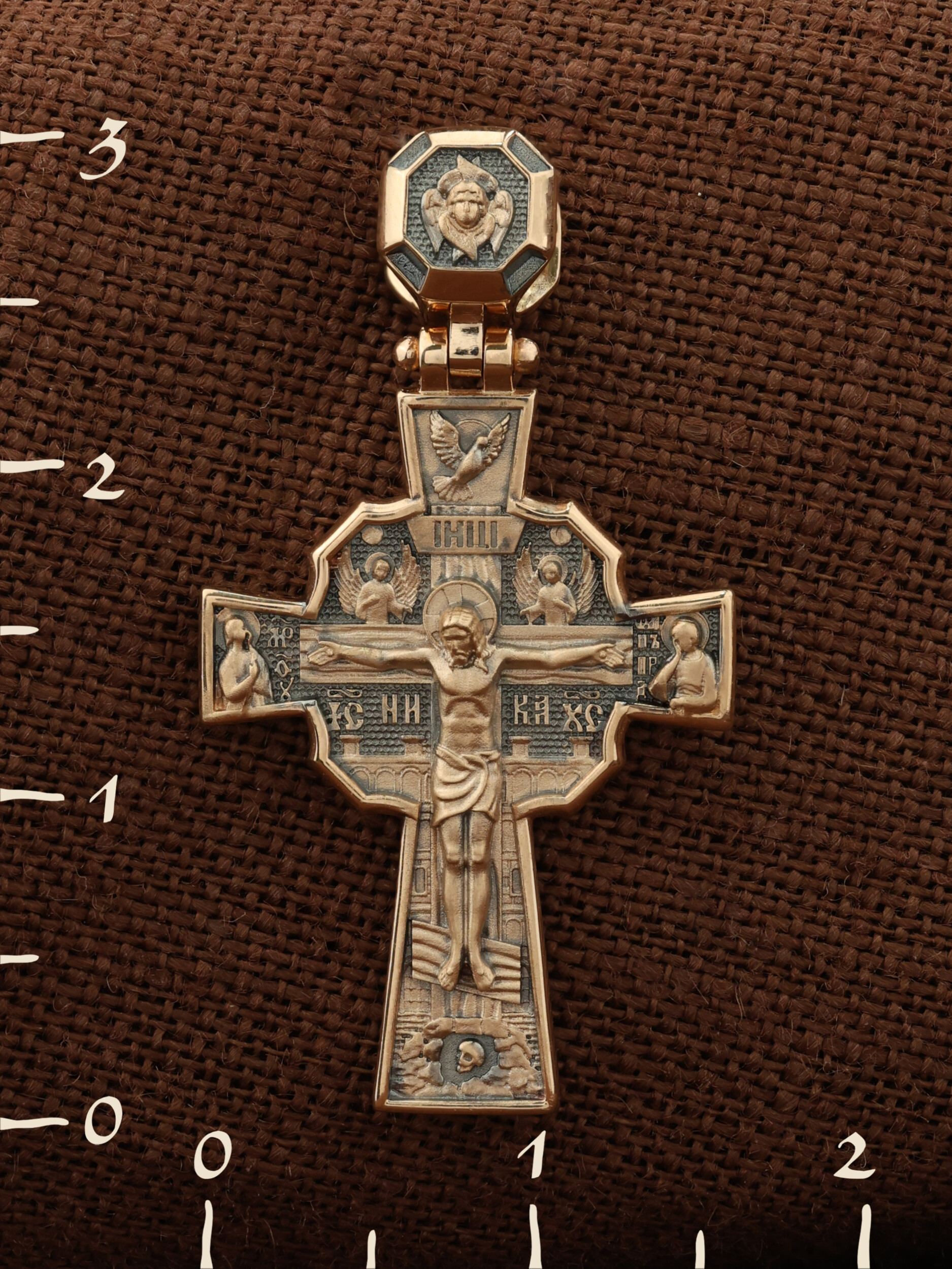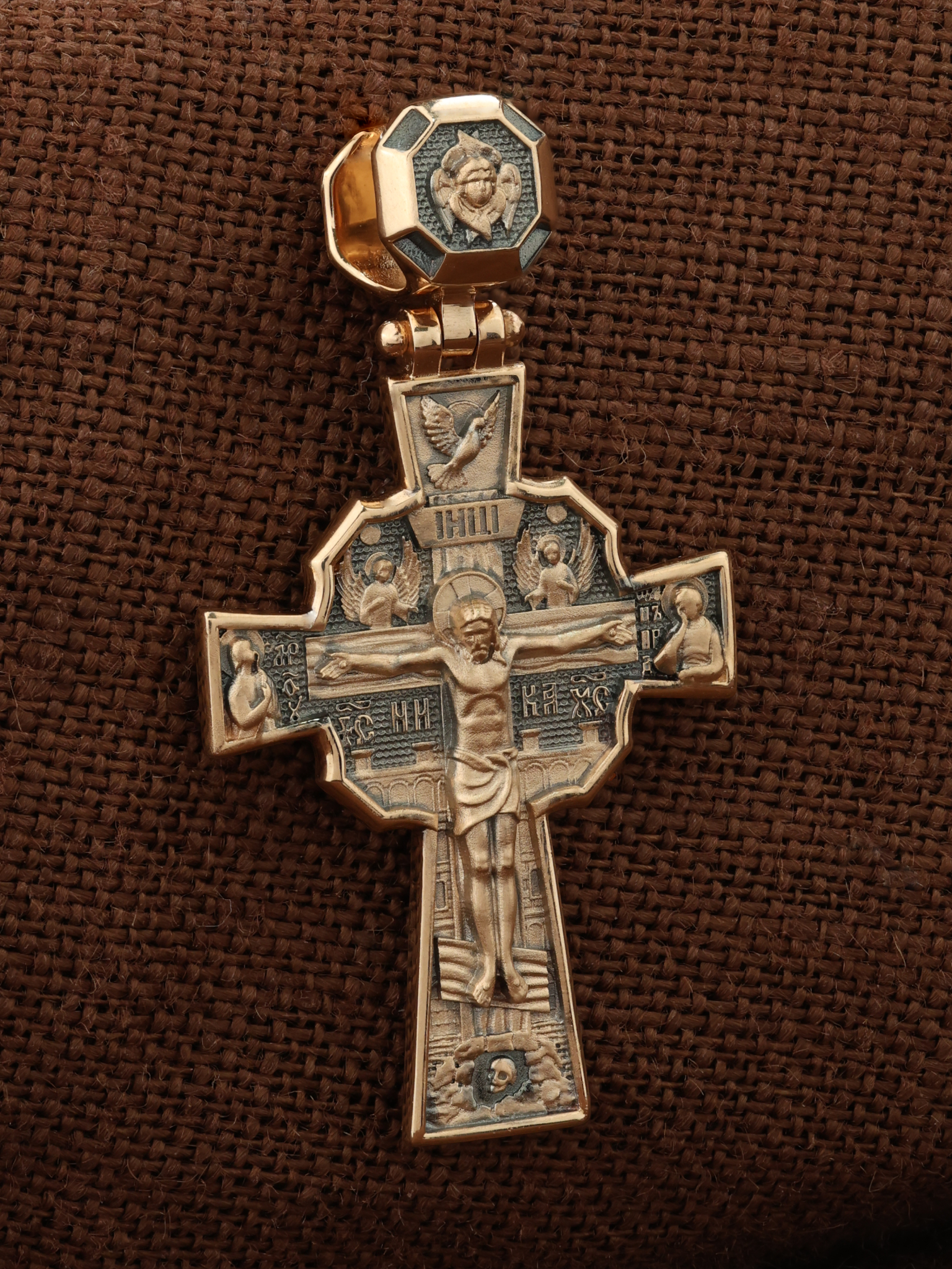 Над Распятием изображен парящий голубь — символ Святого Духа и Его благодати. На кулонном кольце изображен шестикрылый Серафим — самый приближенный к Господу Ангел.
