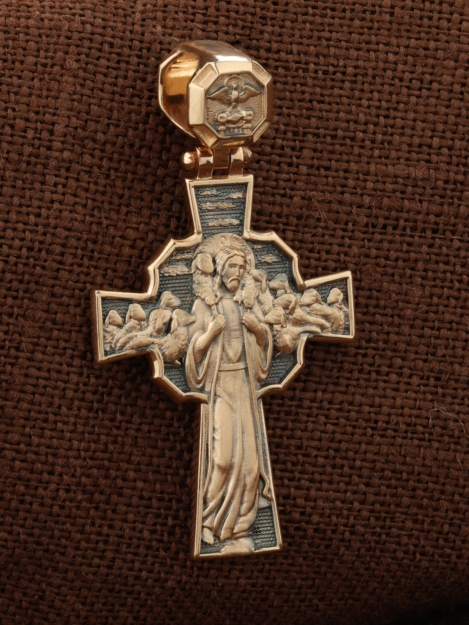 Но обратной стороне креста изображение Иисуса Христа. Добрый Пастырь — символическое именование и изображение Иисуса Христа, заимствованное из Ветхого Завета и повторенное Христом в Новом Завете в своей роли учителя. Иисус изображается с заблудшей овцой, вскинутой на плечи (Лк. 15:3−7).
