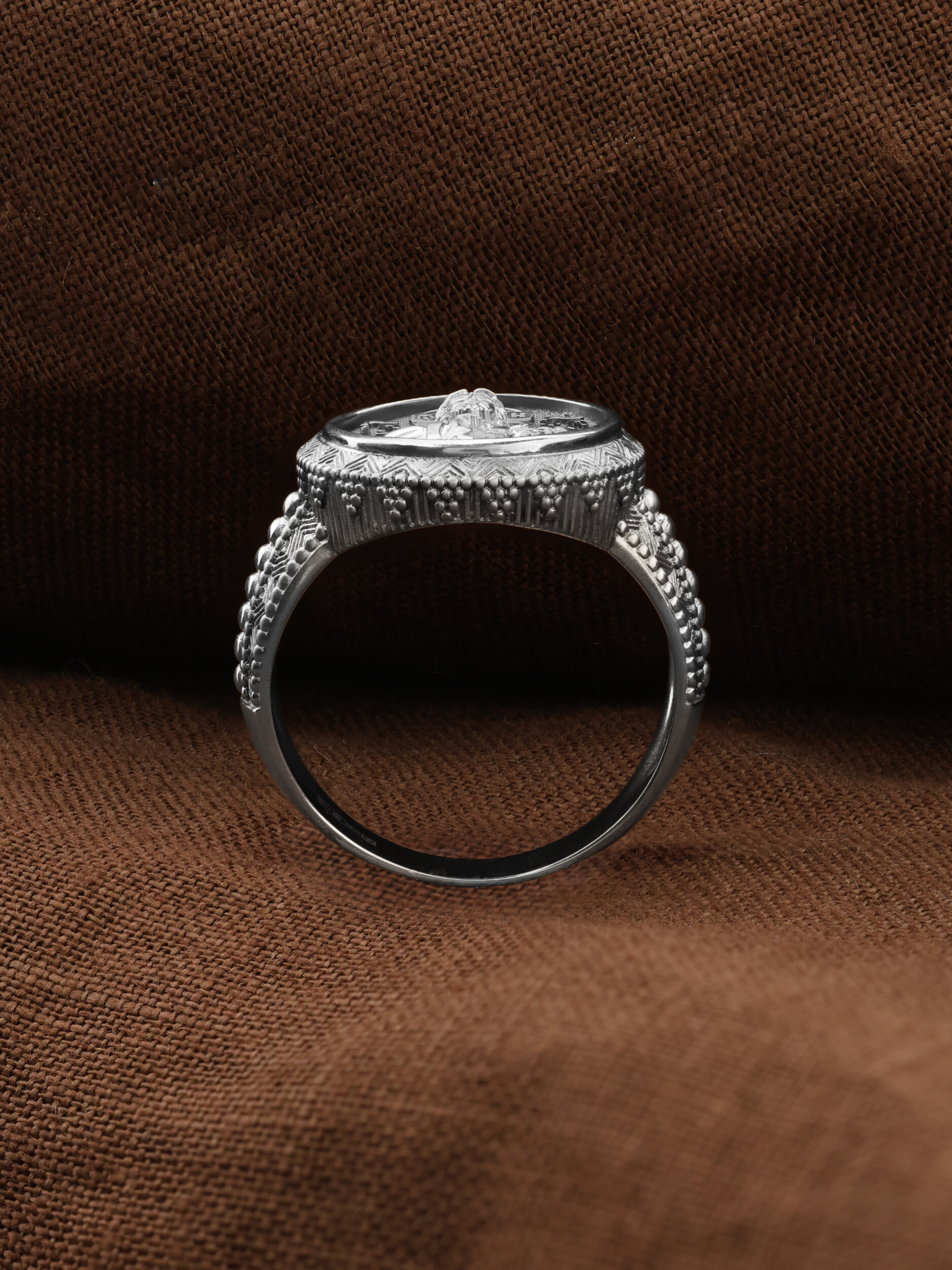 Кольцо «Господь Вседержитель» выполнено в древних христианских традициях. Господь Вседержитель или Пантократор (от греч. всевластный, всесильный). Он представлен как Царь Небесный и будущий Судия мира. Именование Иисуса «Вседержителем» указывает, с одной стороны, на Его Божественную природу: «Аз есмь Альфа и Омега, начало и конец, говорит Господь, Который есть и был и грядет, Вседержитель» (Откр. 1: 8). С другой стороны, такое именование связано и с человеческой природой Христа, искупившего крестной жертвой людские грехи и обновившего тем самым человеческую природу. Господь Иисусь Христос изображен фронтально огрудно. Главу Спасителя осеняет нимб, на нем угадывается крест. Крест символизирует голгофскую жертву Спасителя. По греческой традиции, на нимбе написаны буквы Омега, Омикрон, Ню — вместе они обозначают слово Сущий, одно из имен и характеристику Бога, согласно Священному Писанию. Правой рукой Он благословляет, а левой держит Евангелие — благую весть, принесенную Христом всему миру. Также означает она тот новый мир, который будет сотворен Богом после второго пришествия Христа. Символизирует и Книгу Жизни, где записаны имена всех, возлюбивших Бога. Всемогущий Бог предстает здесь не как обличающий судья, а как милостивый отец, ждущий возвращения блудных детей.