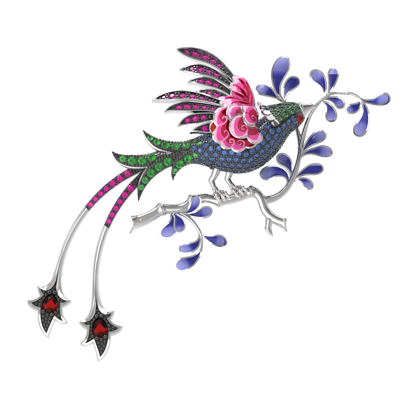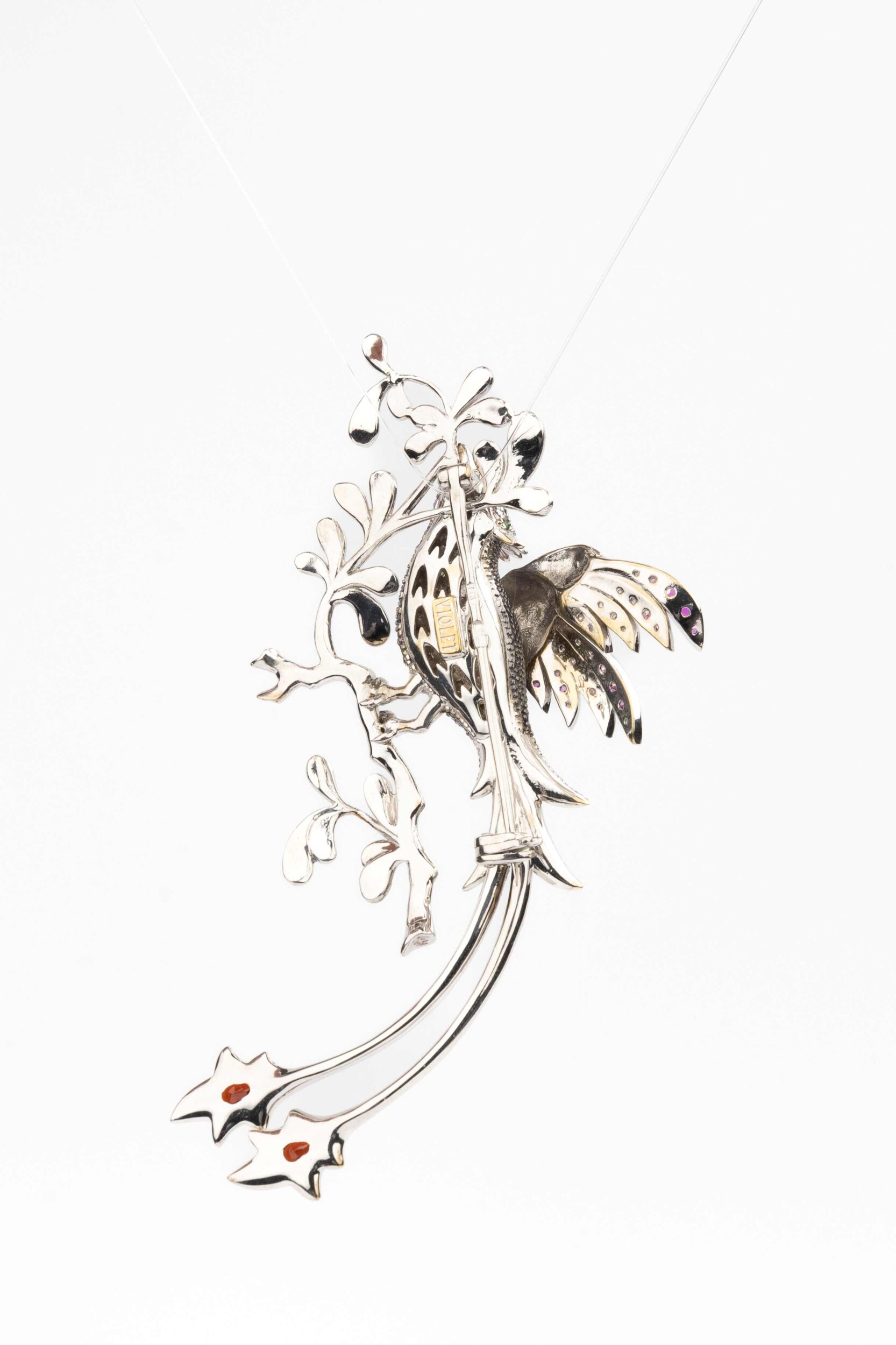Брошь из белого золота c эмалью, фианитом и гранатом