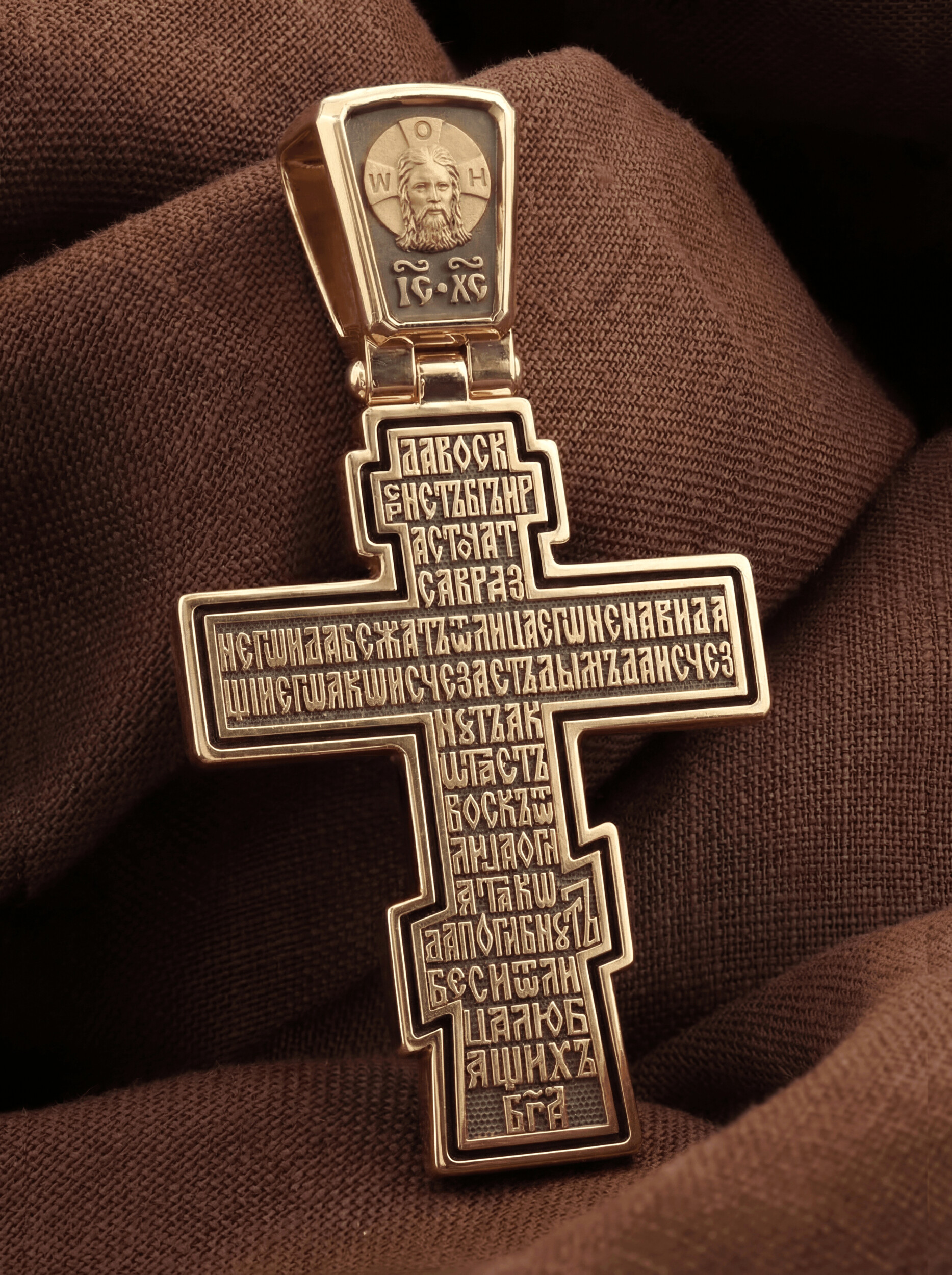 На обороте написаны начальные стихи оградительной молитвы Честному Кресту Господню. Эту молитву читают в опасности, а также носят при себе для защиты от злых сил: Да воскреснет Бог, и расточатся врази Его, и да бежат от лица Его ненавидящий Его. Яко исчезает дым, да исчезнут; яко тает воск от лица огня, тако да погибнут беси от лица любящих Бога и знаменующихся крестным знамением, и в веселии глаголющих: радуйся, Пречестный и Животворящий Кресте Господень, прогоняй бесы силою на тебе пропятаго Господа нашего Иисуса Христа, во ад сшедшаго и поправшаго силу диаволю, и даровавшаго нам тебе Крест Свой Честный на прогнание всякаго супостата. О, Пречестный и Животворящий Кресте Господень! Помогай ми со Святою Госпожею Девою Богородицею и со всеми святыми во веки. Аминь»