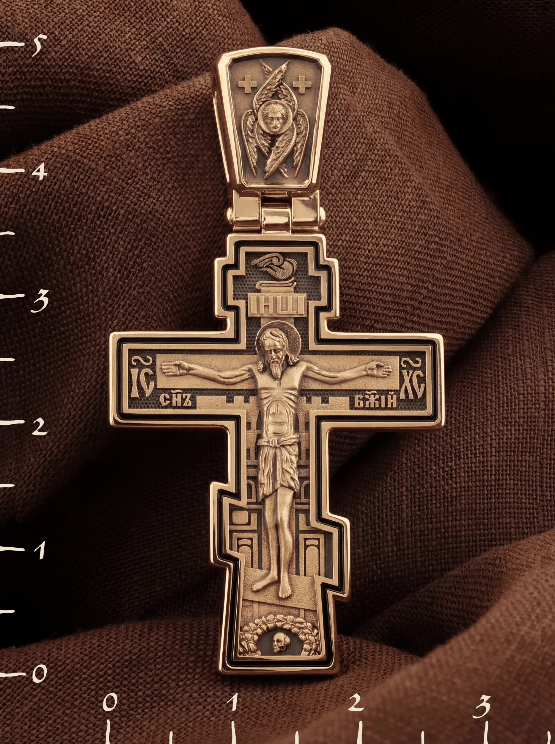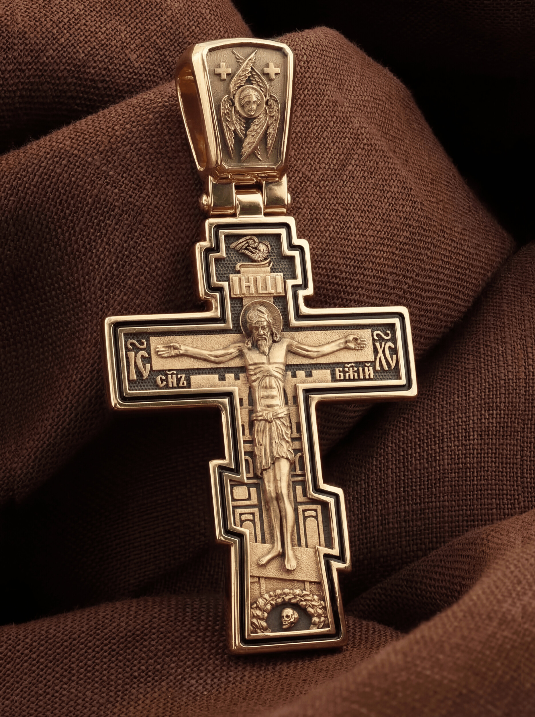 Восьмиконечный нательный крест с Распятием Иисуса Христа на горе Голгофе. Форма этого кресты является одной из самых распространенных на Руси и более всего соответствует тому Кресту, на котором был распят Христос.