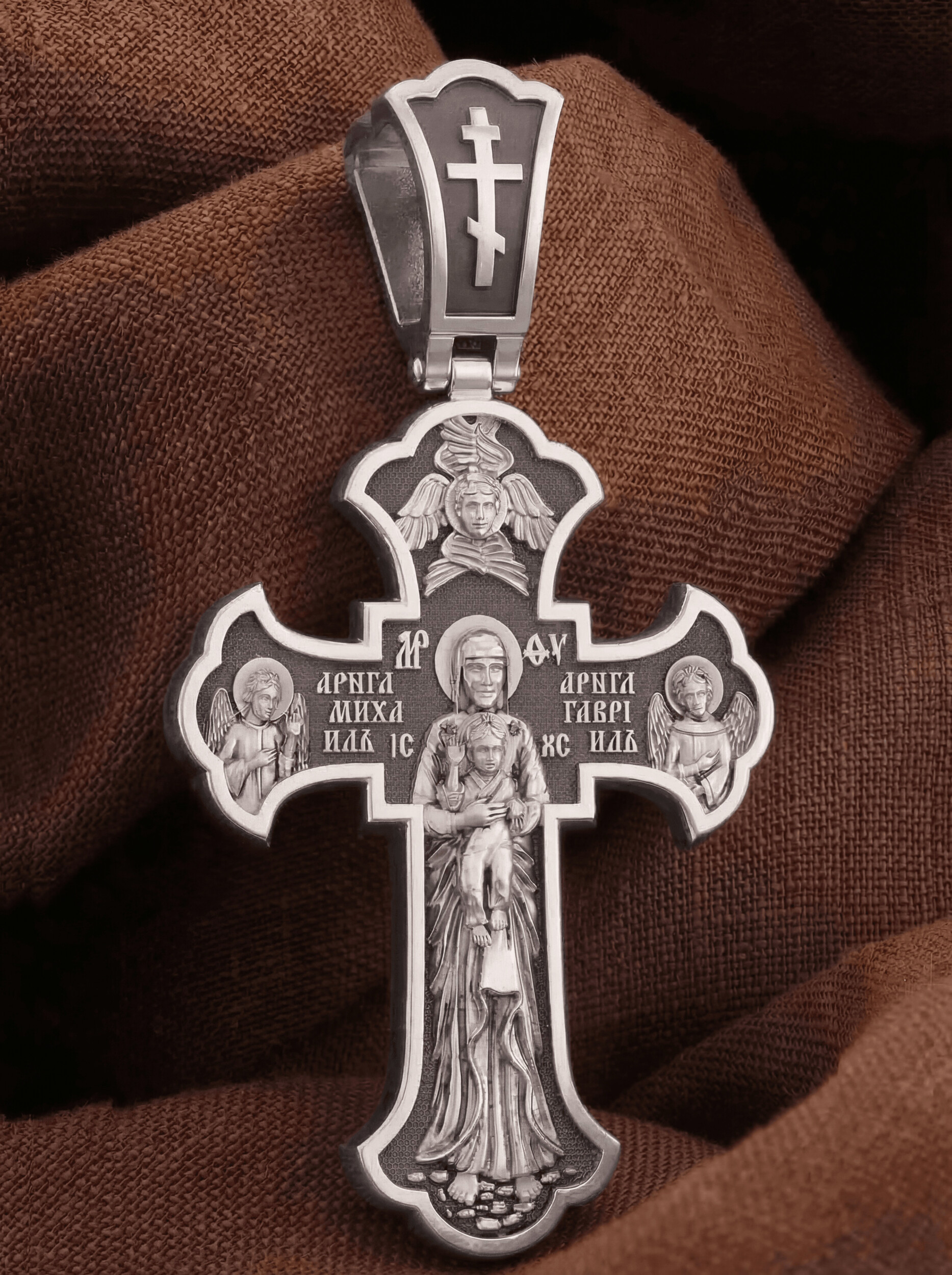 На обратной стороне креста в полный рост изображена Валаамская икона Божией Матери, над которой раскрыл свои крылья серафим. Этот образ написал в 1878 году иеромонах Валаамского монастыря о. Алипий. Валаамскую икону прославили многие чудеса, ее считают целительницей при разных недугах. Перед этим образом Богородицу молят в первую очередь об укреплении веры, просят даровать смирение, твердость в соблюдении заповедей Христовых и об исцелении. Богородице предстоят два архангела, Михаил и Гавриил.