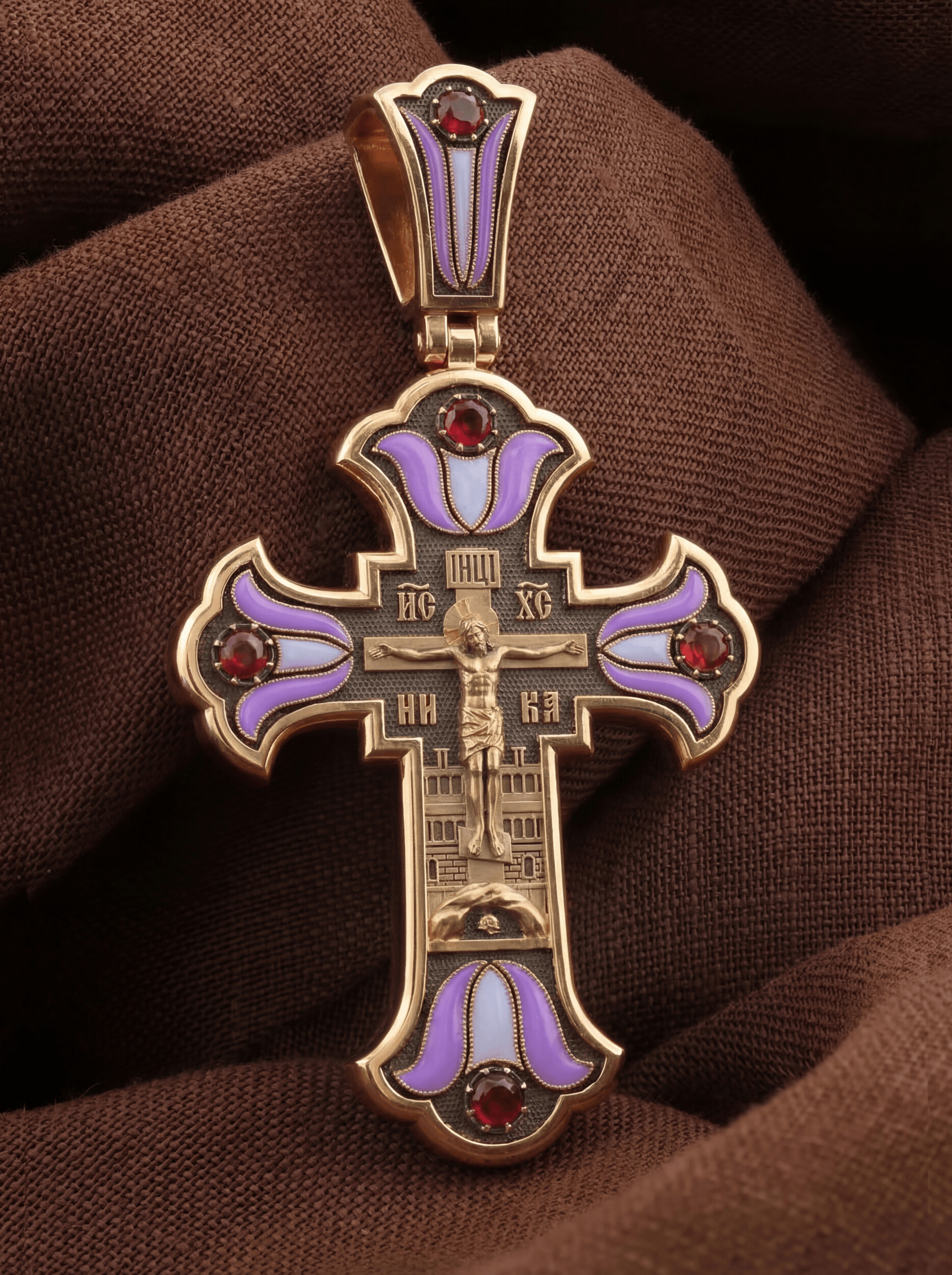 На лицевой стороне креста изображено Распятие Господа и Спасителя нашего Иисуса Христа. Христос, подвергнутый на кресте мучительной казни, своими страданиями искупил нас от древнего греха и даровал нам жизнь вечную. На верхней табличке, выше головы Иисуса, расположена надпись, составленная Понтием Пилатом — «IНЦI». Она означает «Иисус Назорей, Царь Иудейский». Надписи «IС» « ХС» означает Иисус Христос и слово «НИКА», что означает «победитель», помещается на разных сторонах поперечной перекладины креста. За крестом высится Иерусалимская стена, в знак того, что Господь был распят вне стен города. Крест стоит на горе камней, символизирующих Голгофу. Под подножием Креста изображена покоящаяся голова (череп) Адама, грехи которого Христос омыл Своею Кровью.