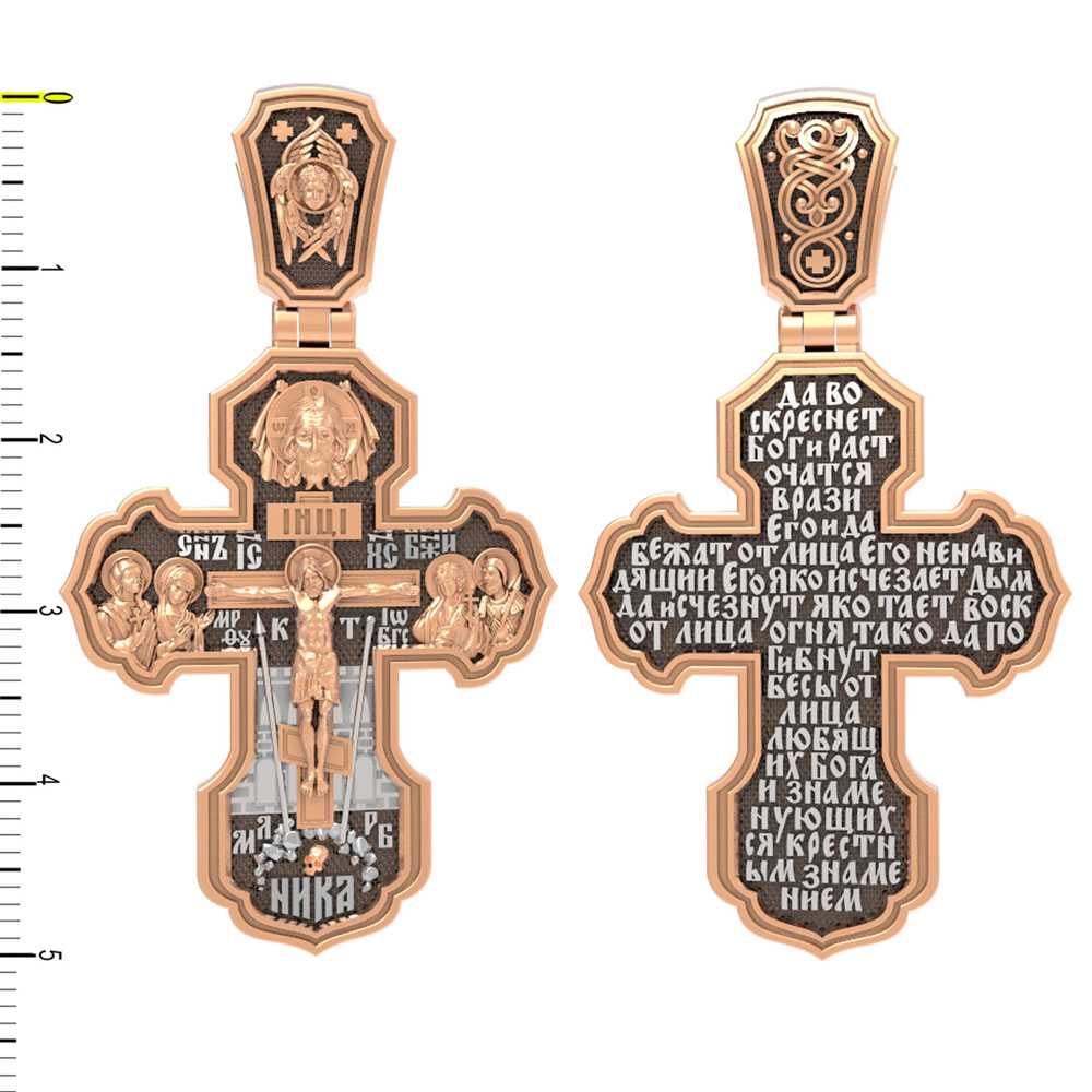 На лицевой стороне креста изображено Распятие Господа и Спасителя нашего Иисуса Христа. Крест- символ спасения и искупления рода человеческого, знамение победы над смертью и адом. Иисус Христос, как искупительная жертва освобождения человечества от власти греха, умер крестной смертью и в третий день воскрес. На верхней табличке, выше головы Иисуса, расположена надпись, составленная Понтием Пилатом — «IНЦI». Она означает «Иисус Назорей, Царь Иудейский». Надпись «IС» « ХС» означает Иисус Христос и помещается на разных сторонах поперечной (большой) перекладины креста. Рядом расположена надпись «Сын Божий». Выше Распятия изображен Нерукотворный образ Господа и Спасителя нашего Иисуса Христа. Слева от Распятия — Пресвятая Богородица и святая мироносица Мария Магдалина с крестом в руке. Справа — апостол и евангелист Иоанн Богослов, один из ближайших учеников Иисуса Христа и сотник Лонгин с крестом в правой руке и копьем — в левой. За крестом высится Иерусалимская стена. Крест стоит на горе камней, символизирующих Голгофу. В ее основании различается череп — это голова Адама. Вдоль креста изображены копие сотника Лонгина и трость с губкой и буквы «К» и «Т». Надпись «МЛРБ» — «место лобное рай бысть» означает, что место лобное стало раем и помещаются в нижней части креста. Рядом — слово «НИКА», что означает «победитель». На православном кресте Христос не умирает, а свободно простирает руки, ладони Иисуса открыты, будто он хочет обнять все человечество, даря им свою любовь и открывая путь к вечной жизни. На кулонном кольце изображен шестикрылый Серафим.