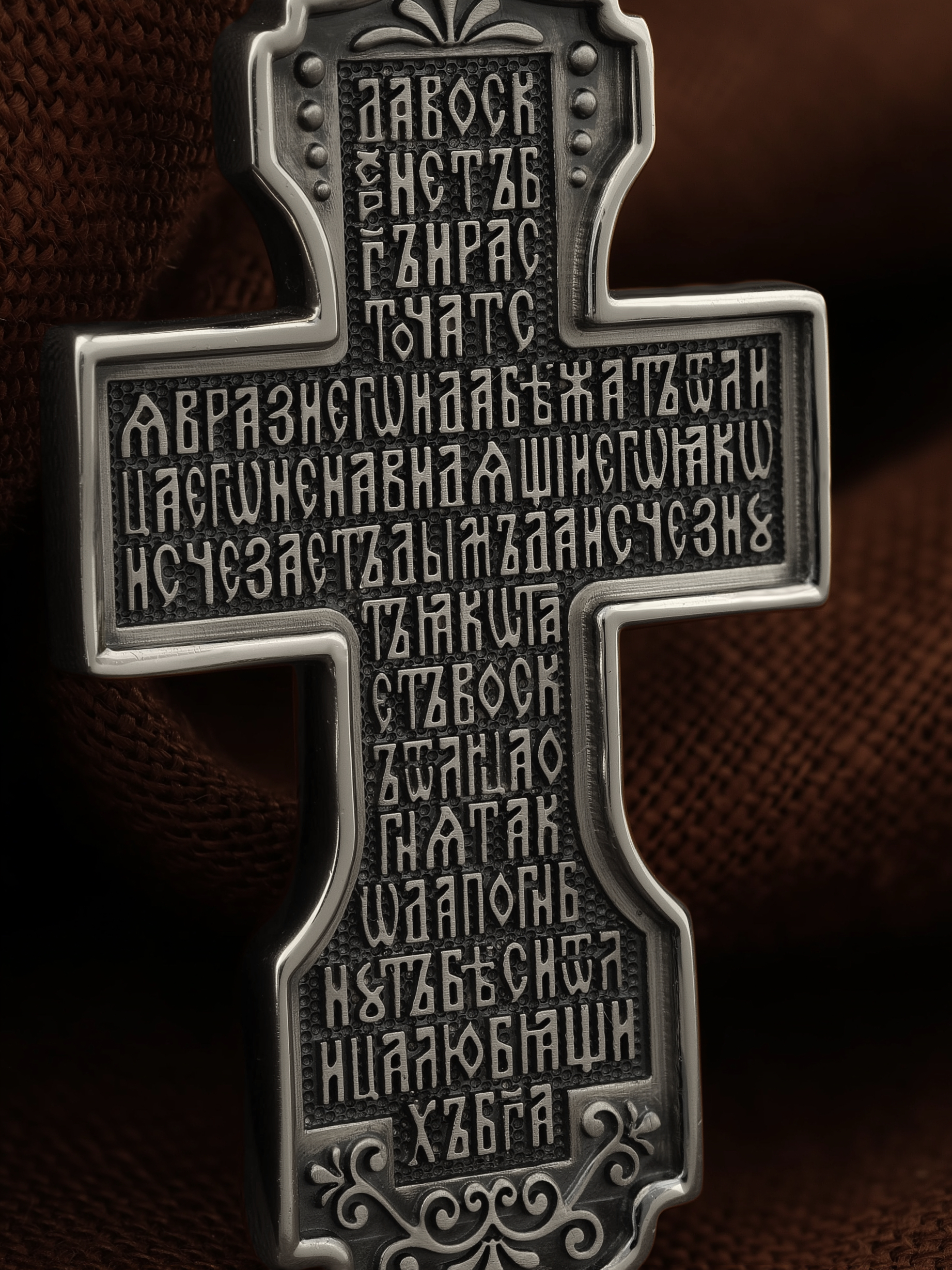 На оборотной стороне креста помещена молитва Честному Кресту Господню: «Да воскреснет Бог, и расточатся врази Его, и да бежат от лица Его ненавидящии Его. Яко исчезает дым, да исчезнут; яко тает воск от лица огня, тако да погибнут беси от лица любящих Бога…». На кулонном кольце изображен шестикрылый Серафим.