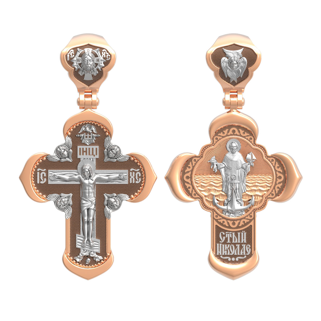 На лицевой стороне креста изображено Распятие Господа и Спасителя нашего Иисуса Христа, отдавшего Себя на смерть, для искупления грехов мира. Крест является символом жертвенной любви Всеблагого Бога к падшим людям, всепобеждающим духовным оружием христиан, основанием и средоточием церковной жизни. Господь сказал: «кто хочет идти за Мною, отвергнись себя, и возьми крест свой, и следуй за Мною». (Мк. 8: 34). На верхней табличке, выше головы Иисуса, расположена надпись, составленная Понтием Пилатом — «IНЦI». Она означает «Иисус Назорей, Царь Иудейский». Надпись «IC» «ХC», означает Иисус Христос, помещается на разных сторонах поперечной перекладины креста. Крест стоит на горе камней, символизирующих Голгофу. В ее основании различается череп– это голова Адама. На кулонном кольце изображен Нерукотворный образ Господа и Спасителя нашего Иисуса Христа, чудесно отпечатавшийся на плате, которым Христос вытер свой лик.