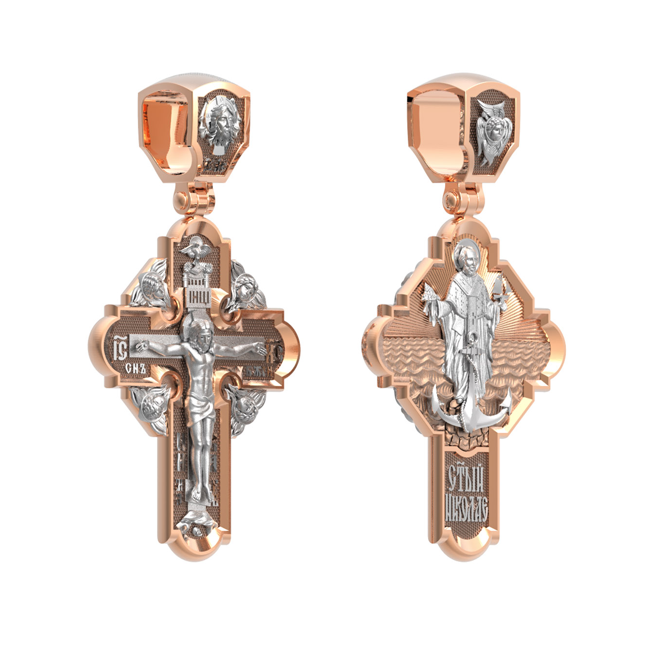 На лицевой стороне креста изображено Распятие Господа и Спасителя нашего Иисуса Христа, отдавшего Себя на смерть, чтобы другие могли жить — жить вечной жизнью, жить с Богом. Своею кровью Господь освятил крест и сделал его проводником Своей благодати, источником освящения верующих. На верхней табличке, выше головы Иисуса, расположена надпись, составленная Понтием Пилатом — «ИНЦИ». Она означает «Иисус Назорей, Царь Иудейский». Надпись «IС ХС» означает Иисус Христос помещается на разных сторонах поперечной (большой) перекладины креста. На кулонном кольце помещено изображение Духа Святого в виде голубя, сходящего с Небес
