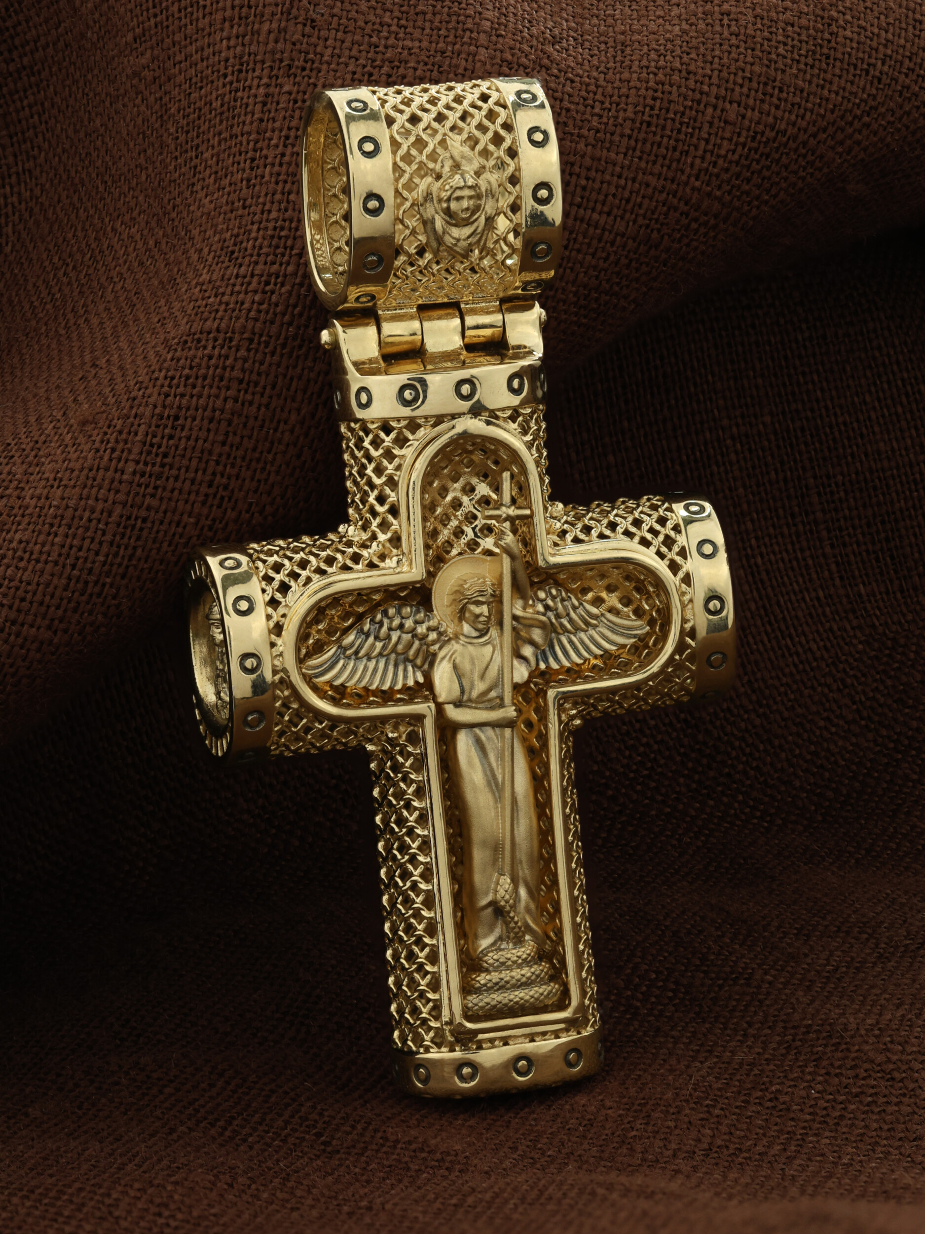 На лицевой стороне креста изображено Распятие Господа и Спасителя нашего Иисуса Христа. Крест- символ спасения и искупления рода человеческого, знамение победы над смертью и адом. Иисус Христос, как искупительная жертва освобождения человечества от власти греха, умер крестной смертью и в третий день воскрес. Распятие сопровождается каноническими надписями. На верхней табличке, выше головы Иисуса, расположена надпись, составленная Понтием Пилатом — «IНЦI». Она означает «Иисус Назорей, Царь Иудейский». Надписи «IC» «ХC», означает Иисус Христос, «НИКА», что означает Победитель, «Царь Славы» и «Сын Божий», размещается на разных сторонах поперечной перекладины креста. Крест стоит на горе камней, символизирующих Голгофу, которая обозначена надписью «Г Г». В ее основании различается череп — это голова Адама, обозначенный надписью «Г А». Надпись «МЛРБ» — «место лобное рай бысть» означает место лобное стало раем. Вдоль креста изображены орудия Страстей Христовых: копие сотника Лонгина, которым пронзили подреберье мёртвого Иисуса, чтобы убедиться в Его смерти, и трость с губкой, с которой Иисуса напоили уксусом. Они обозначены буквами «К» и «Т». На кулонном кольце размещен «Нерукотворный образ Иисуса Христа», на оборотной стороне кулонного кольца- шестикрылый Серафим.