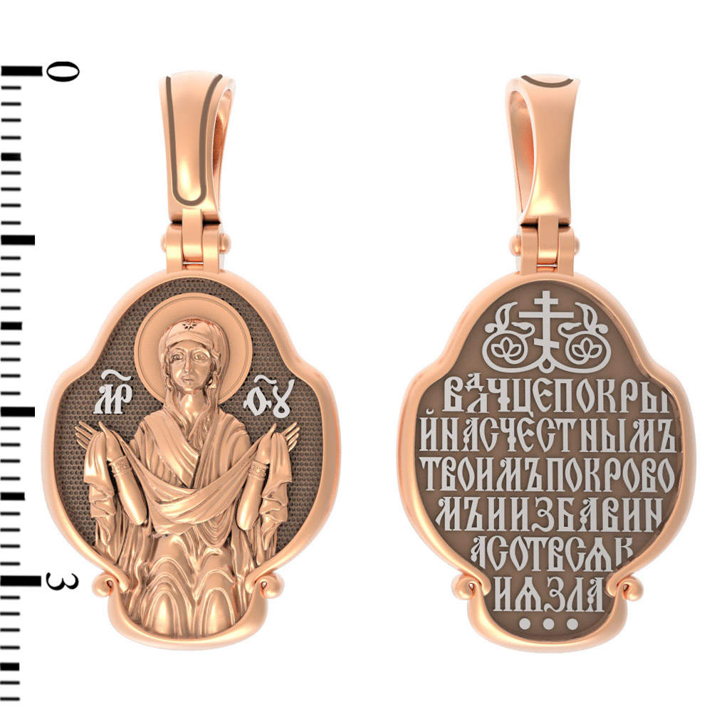 На лицевой части образка изображена икона Покров Пресвятой Богородицы. Праздник Покрова Божией Матери является воспоминанием чуда, которое произошло во Влахнернской церкви 1 (14) октября 910 года: Пресвятая Богородица явилась верующим над алтарем храма и распростерла над ними Свое покрывало. В этот день Божья Матерь открыла людям, что Она является Ходатаицей за них перед Богом. Богородица простирает Свой молитвенный покров над всеми православными христианами и умоляет Сына Своего о даровании вечного спасения каждому человеку.