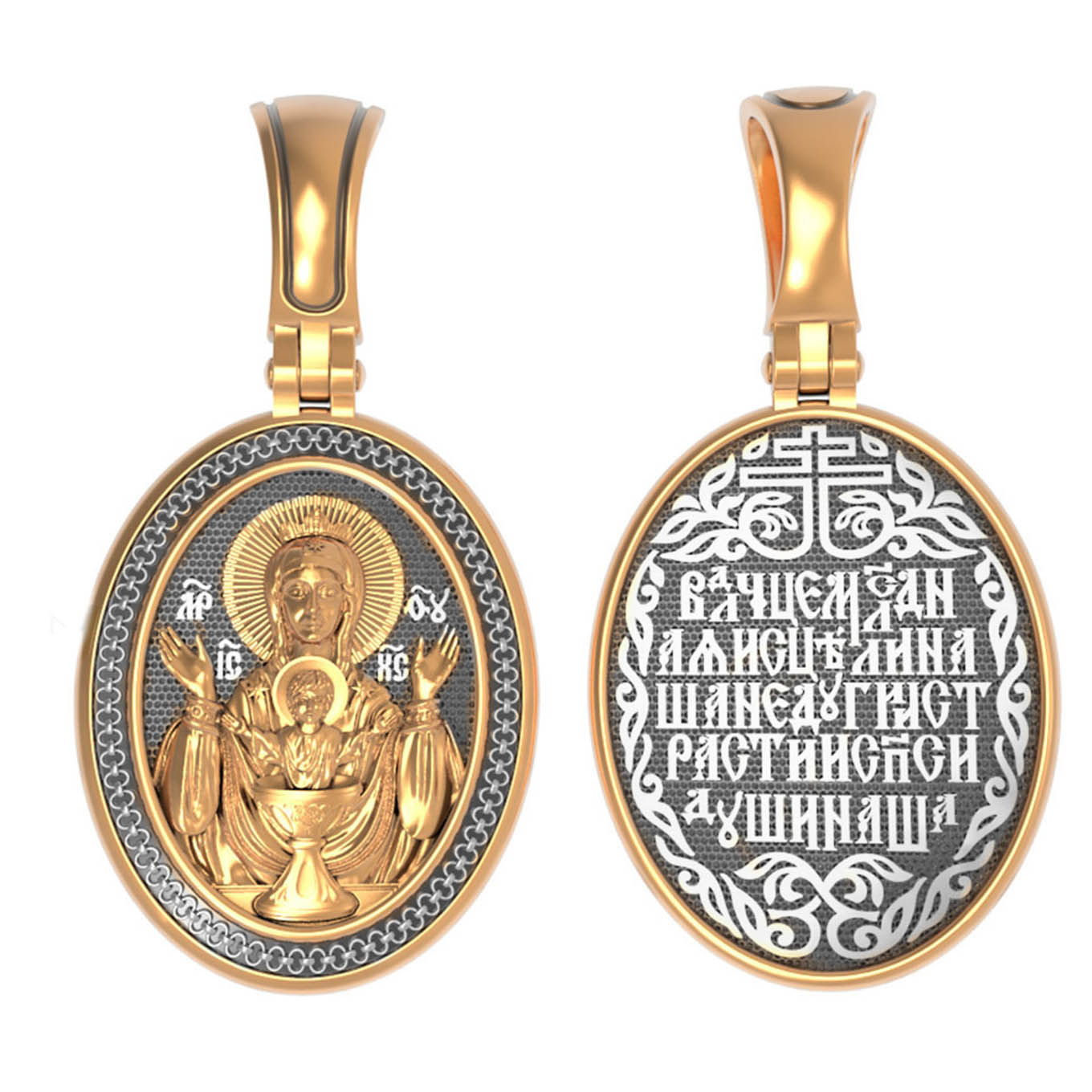На лицевой части образка изображена икона Божией Матери «Неупиваемая чаша». Икона славится помощью в исцелении зависимостей, помогает людям обрести свободу от греховных страстей.