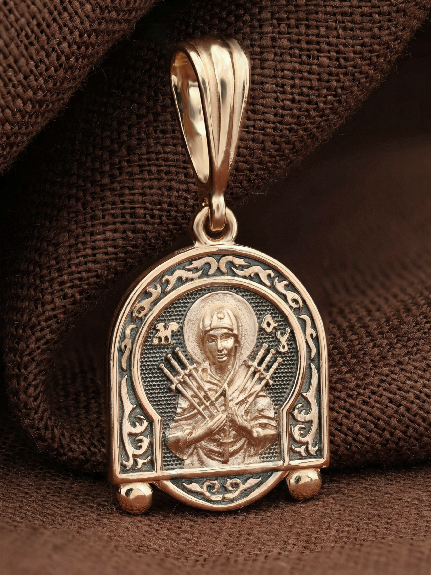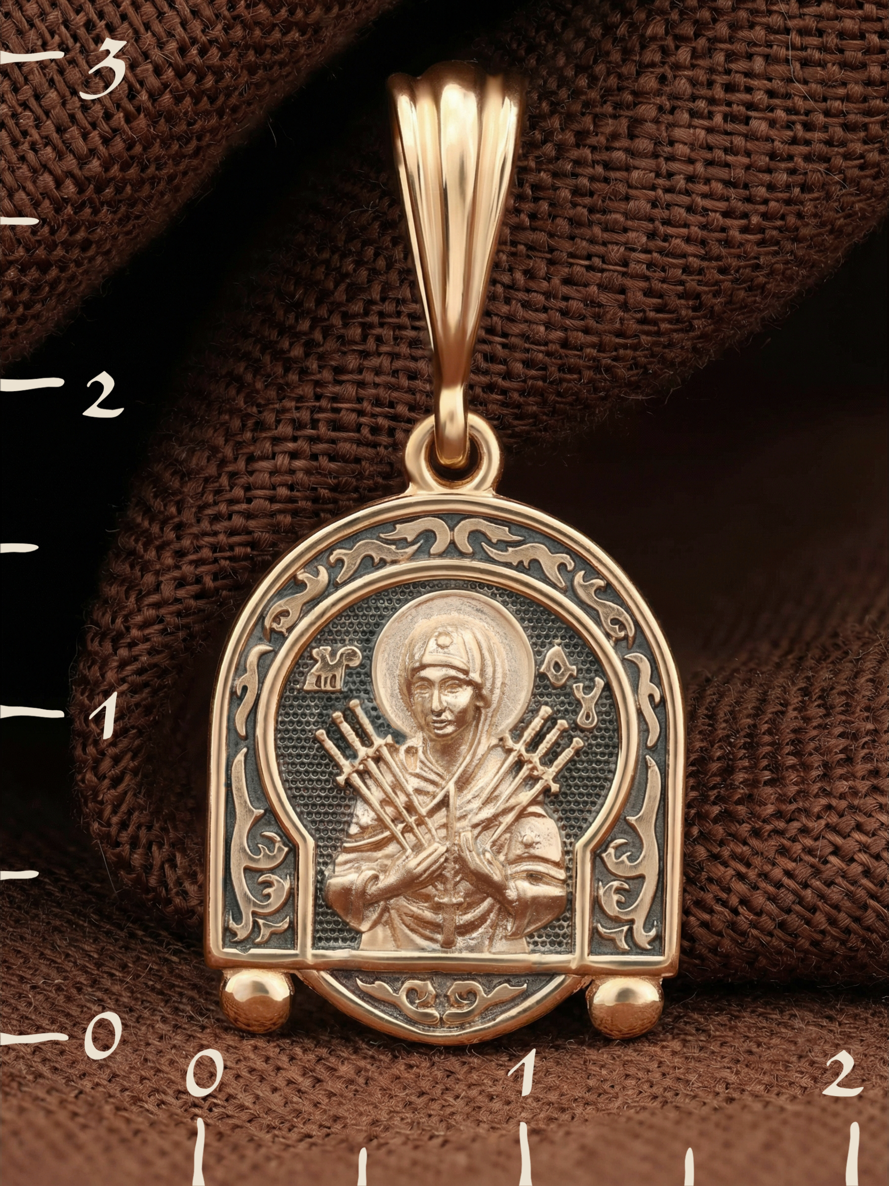 На лицевой стороне образка изображена икона Пресвятой Богородицы «Семистрельная» — одна из самых чудотворных икон на Руси. На протяжении многих веков христиане взывали к Царице Небесной через эту икону, если в стране начинались войны или мятежи.