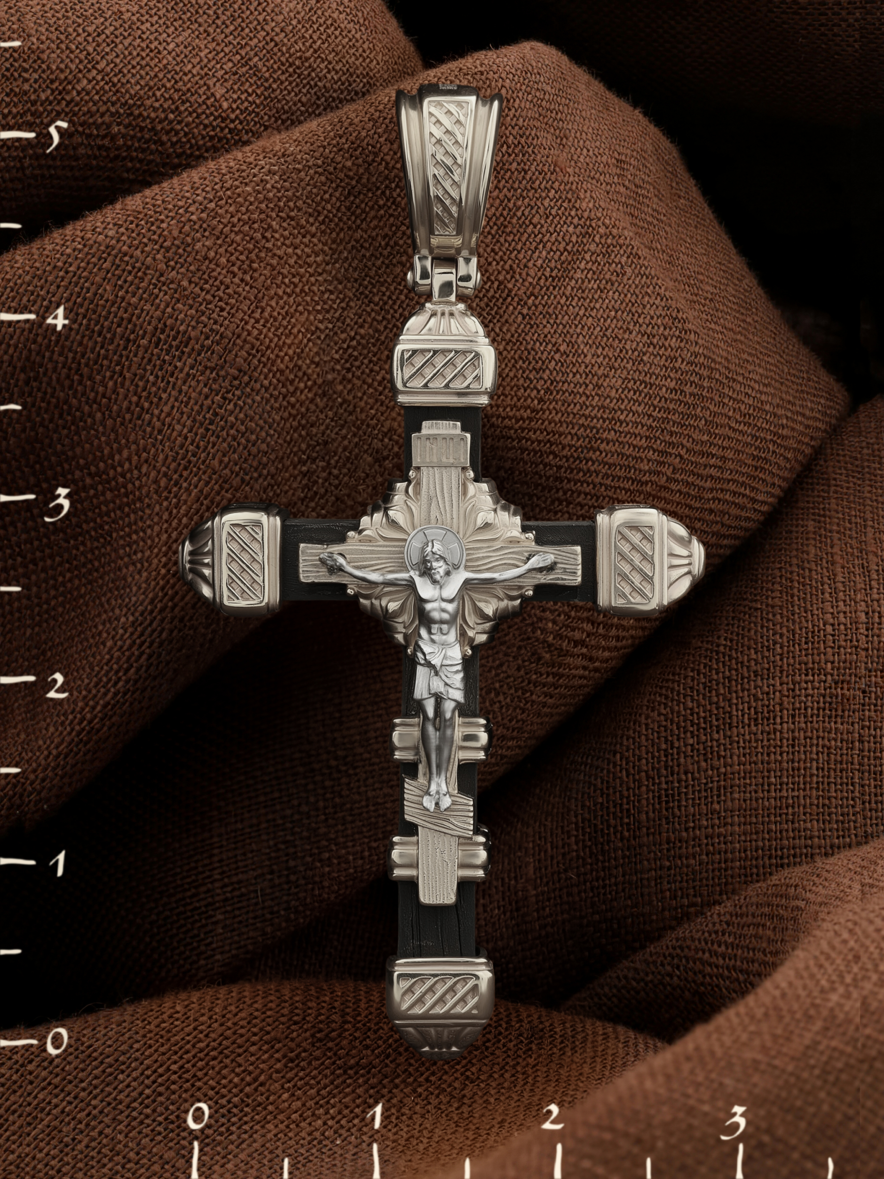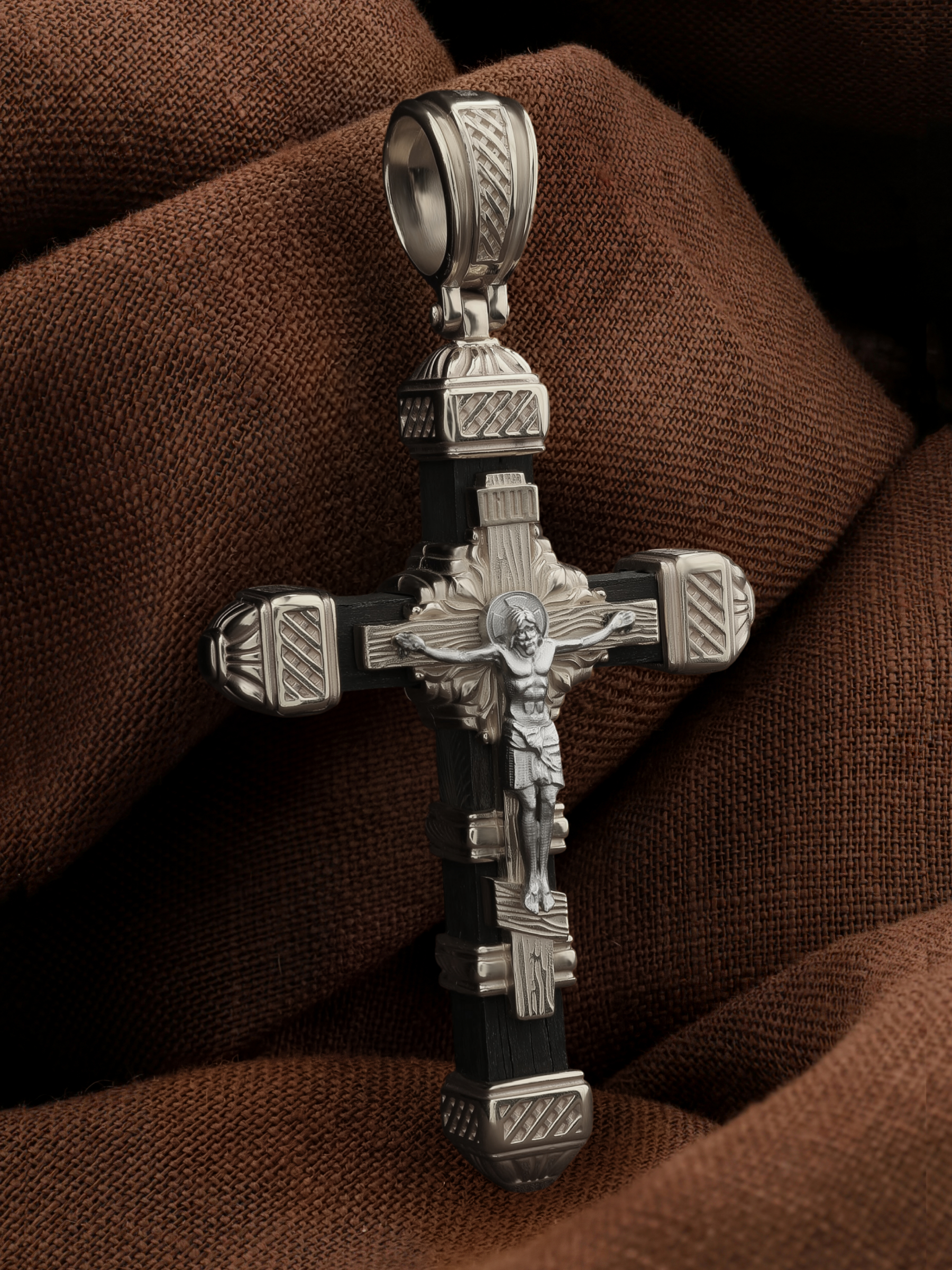 На лицевой стороне креста изображено Распятие Господа и Спасителя нашего Иисуса Христа, отдавшего Себя на смерть, для искупления грехов мира. Крест является символом жертвенной любви всеблагого Бога к падшим людям, всепобеждающим духовным оружием христиан, основанием и средоточием церковной жизни. Верхняя перекладина символизирует титло — табличку, на которой, согласно Евангелию, было начертано: Иисус Назорей Царь Иудейский (IНЦI). Надпись «IС» « ХС» означает Иисус Христос и размещена над поперечной перекладиной. Слева от Распятия изображена Пресвятая Богородица, справа — апостол и евангелист Иоанн Богослов, один из ближайших учеников Иисуса Христа. Возвышение, на котором стоит Крест, символизирует гору Голгофу, на которой произошло Распятие. Под подножием Креста изображена покоящаяся голова (череп) Адама. Под Распятием помещено изображение Духа Святого в виде голубя.