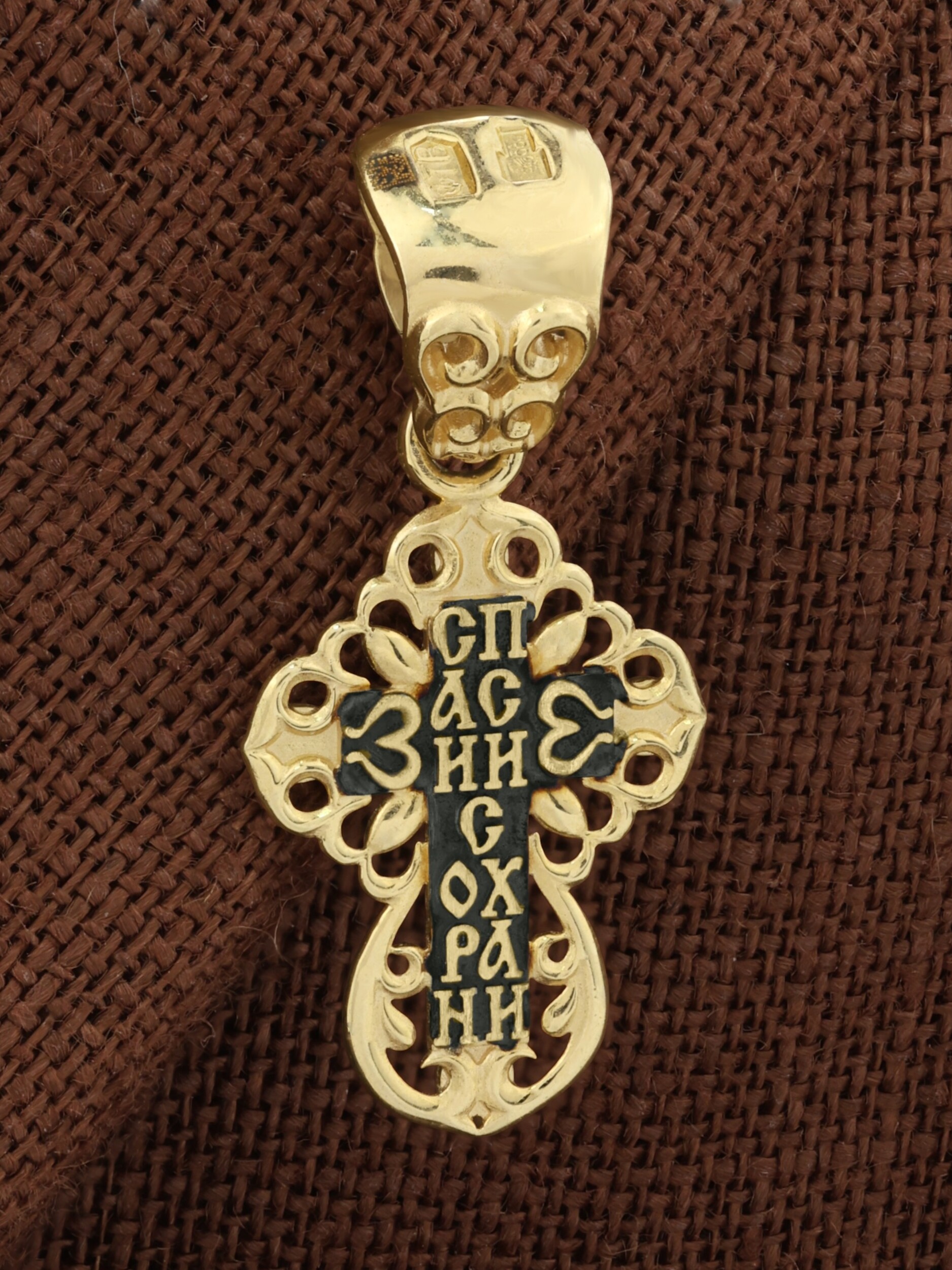 На оборотной стороне креста написана молитва: «Спаси и сохрани». Крест украшен орнаментом.