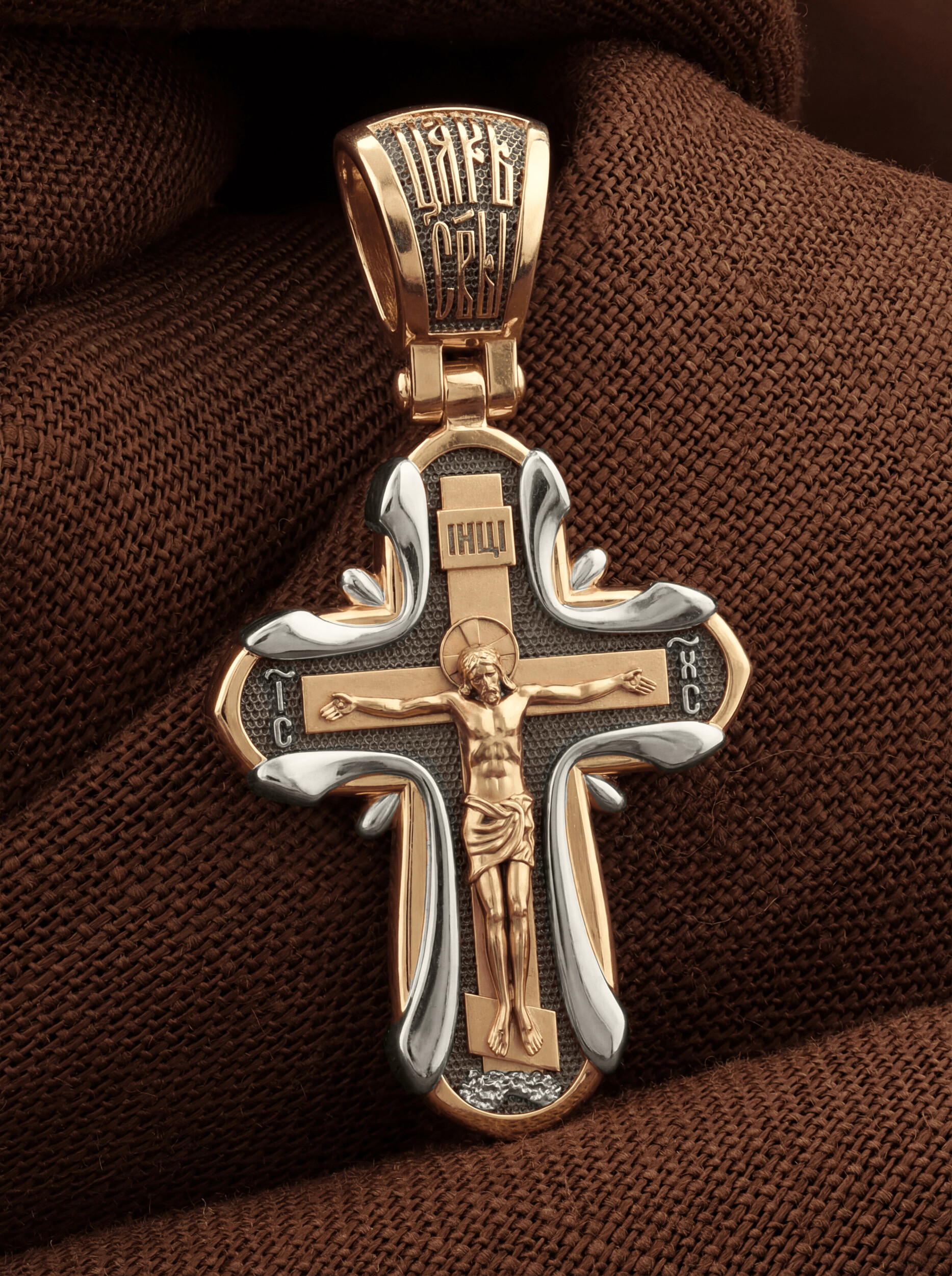 На лицевой стороне креста изображено Распятие Господа и Спасителя нашего Иисуса Христа, отдавшего Себя на смерть, для искупления грехов мира. Крест является символом жертвенной любви Всеблагого Бога к падшим людям, всепобеждающим духовным оружием христиан, основанием и средоточием церковной жизни. Господь сказал: кто хочет идти за Мною, отвергнись себя, и возьми крест свой, и следуй за Мною. (Мк. 8: 34). Над вершиной Распятия, на кулонном кольце, помещена надпись «Царь Славы». На верхней табличке, выше головы Иисуса, расположена надпись, составленная Понтием Пилатом — «IНЦI». Она означает «Иисус Назорей, Царь Иудейский». Надпись «IC» «ХC», означает Иисус Христос, помещается на разных сторонах поперечной перекладины креста. Крест стоит на горе камней, символизирующих Голгофу.