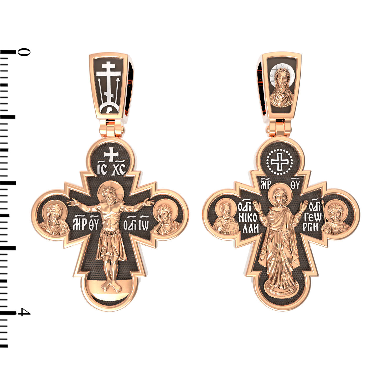 На лицевой стороне этого креста Иисус Христос является как Господь, Творец мира и его Грозный Судия, царящий на Небесах. Православная иконография показывает нам распятого Господа не в виде мучительно умирающего человека, а как величественного и всесильного Бога, который простирает руки, словно обнимает весь мир. Человеческие страдания Господа обычно только обозначаются наклоном Его головы и полузакрытыми глазами. С двух сторон Христу предстоят Пресвятая Богородица и Святой апостол и Евангелист Иоанн Богослов.
