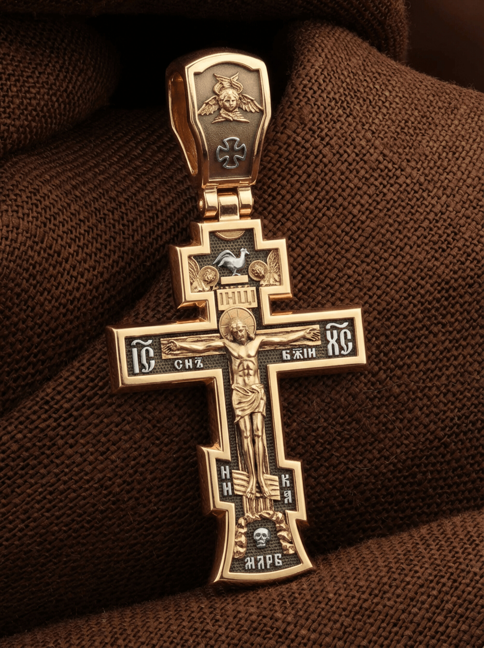 На лицевой стороне этого креста центральную часть занимает икона Распятия Христа — образ жертвы, принесенной Господом за грехи людей. Именно ко Христу, сошедшему на землю ради нашего спасения, возносятся все молитвы. Рядом с Его образом помещены слова — «НИКА» и «Сын Божий». Эти слова характеризуют Господа как Великого Архиерея, победителя смерти. Также Распятие сопровождается надписями, олицетворяющими Христа — это святое имя Христа «IC» (Иисус) «ХС» (Христос). На кулонном кольце написано «Царь Славы».