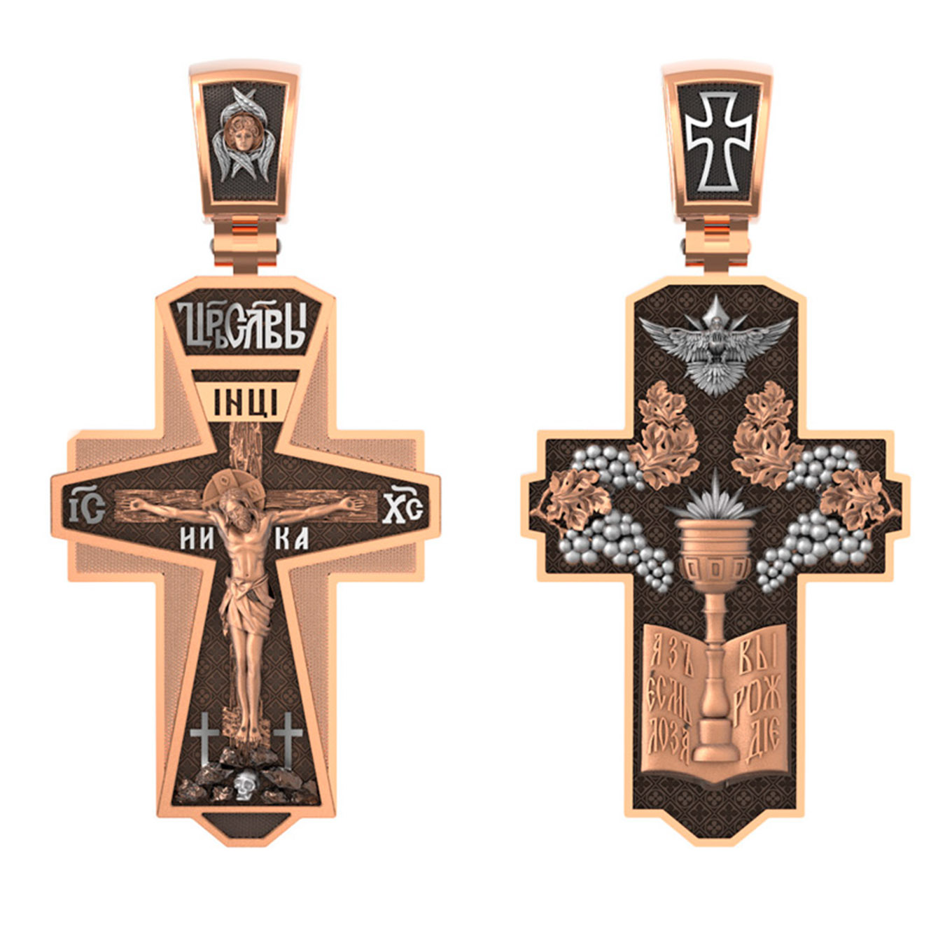 На лицевой стороне креста изображено Распятие, потому что это орудие казни Иисус Христос сделал орудием победы над грехом и смертью. Своими страданиями Он искупил грехи человечества, умерев и сошествовав во ад, победил сатану, освободил души праведников от вечной смерти и открыл им небесные врата рая. Жертва Христа сделала возможным спасение для каждого человека. На православном кресте Христос не умирает, а свободно простирает руки, ладони Иисуса открыты, будто он хочет обнять все человечество, даря им свою любовь и открывая путь к вечной жизни.