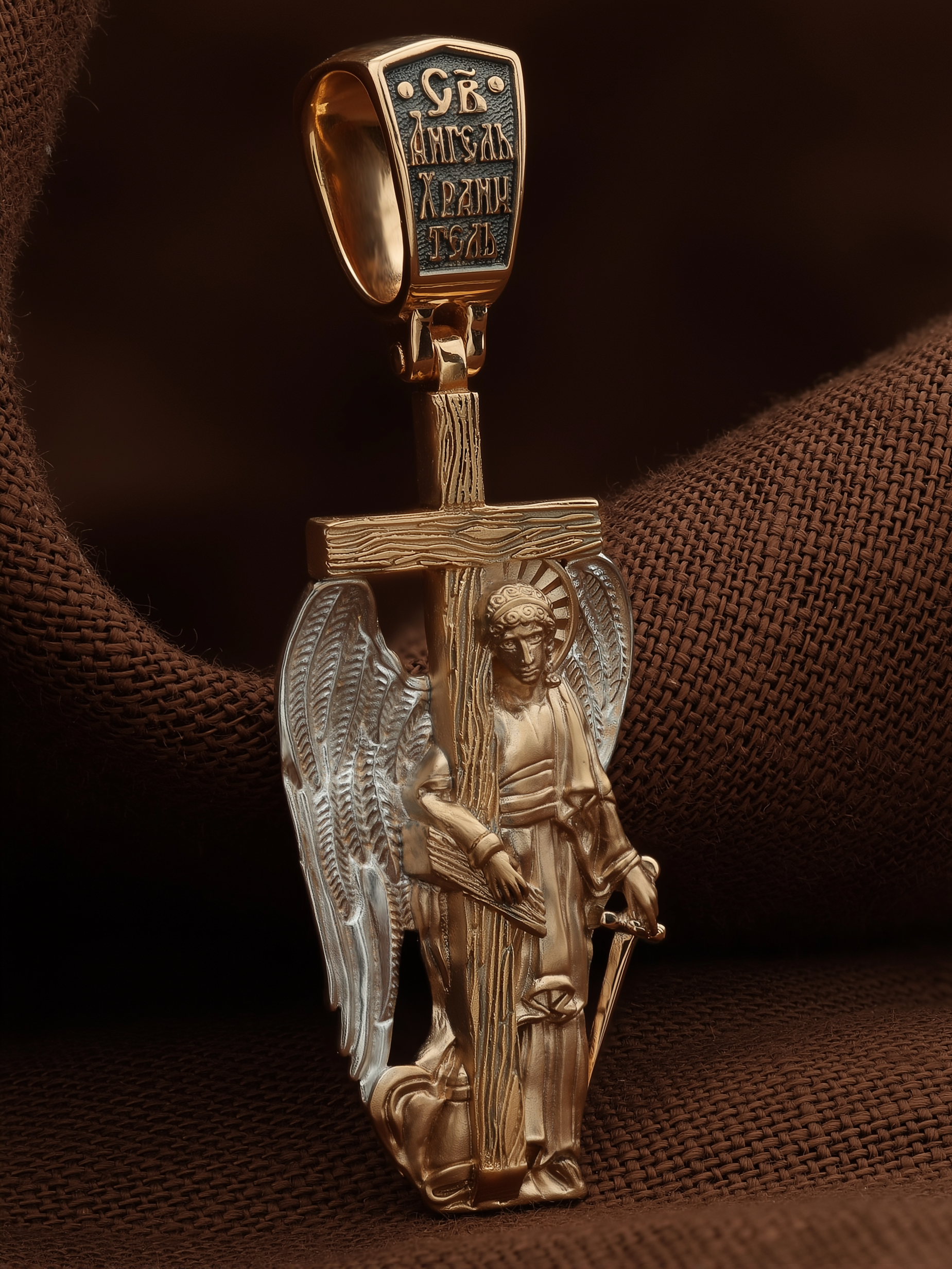 Основой композиции является изображение Святого Ангела-Хранителя держащего в правой руке крест, а в левой — мечь. Крест является символом жертвенной любви всеблагого Бога к падшим людям, всепобеждающим духовным оружием христиан, основанием и средоточием церковной жизни. Господь сказал: «кто хочет идти за Мною, отвергнись себя, и возьми крест свой, и следуй за Мною». (Мк. 8: 34). Ангел-Хранитель — это Ангел приставляемый Богом к человеку при крещении для охраны и помощи в добрых делах. Он невидимо находится при человеке на протяжении всей его жизни, если человек сохраняет в себе любовь к Богу и истинную веру перед Ним. Ангел-Xранитель делают для нас все, что служит к истинному нашему благу и спасению. Невидимо пребывая при нас постоянно, он, руководствуя нас ко спасению, не только по нашему желанию таинственно наставляет нас на все доброе и полезное, не только возносит наши молитвы к Богу, но еще и сам от себя охраняют и защищают нас от врагов видимых и невидимых и ходатайствует за нас пред Богом. Ангел-Хранитель так любит нас, как никто на земле любить не может. Ангел-Хранитель — присный друг наш, незримый тихий собеседник, пресладостный утешитель.