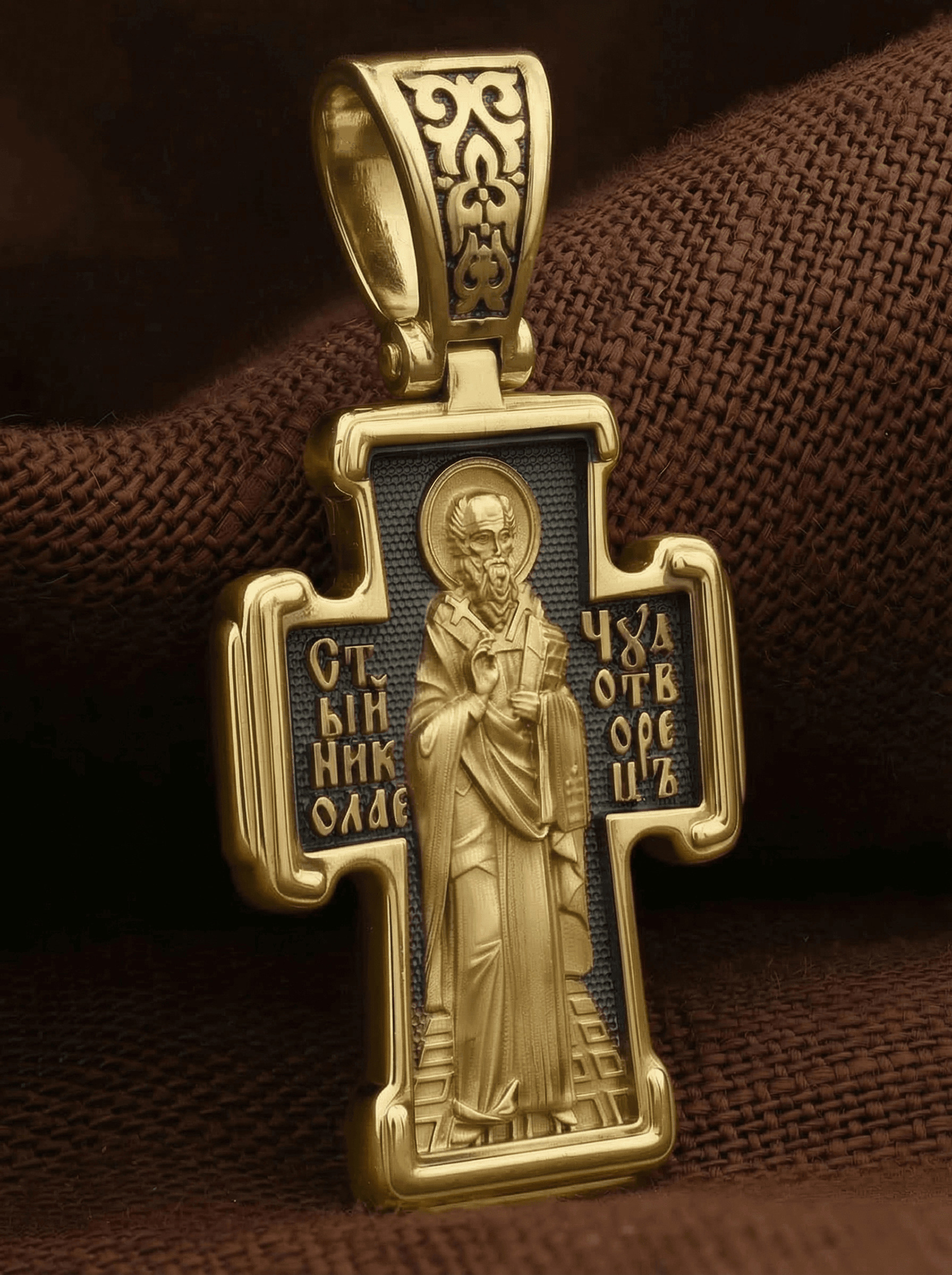 На оборотной стороне креста изображен святитель Николай архиепископ Мир Ликийских, Чудотворец. Он является одним из самых почитаемых святых в православном мире. Святитель Николай родился во второй половине III века в Малой Азии в Ликийском городе Патары. С рождения Божий Угодник проявлял необыкновенные дарования. Сохранилось Предание, что во время крещения он, никем не поддерживаемый, простоял в купели три часа. С детства святитель избегал пустых развлечений, любил молитву, прекрасно учился и проводил свободное время за чтением Священного писания. Приняв сан священника, святитель Николай стал проводить еще более строгую подвижническую жизнь. Вся жизнь святого Николая — это служение Богу. Много великих и преславных чудес сотворил на земле и на море великий Святитель Николай Угодник. Он помогал сущим в бедах, укрощал штормы, спасал от потопления и выносил на сушу из глубины морской, освобождал из плена и приносил освобожденных домой, избавлял от уз и темницы, защищал от посечения мечом, освобождал от смерти и подавал многим различные исцеления, слепым прозрение, хромым хождение, глухим слух, немым дар слова.