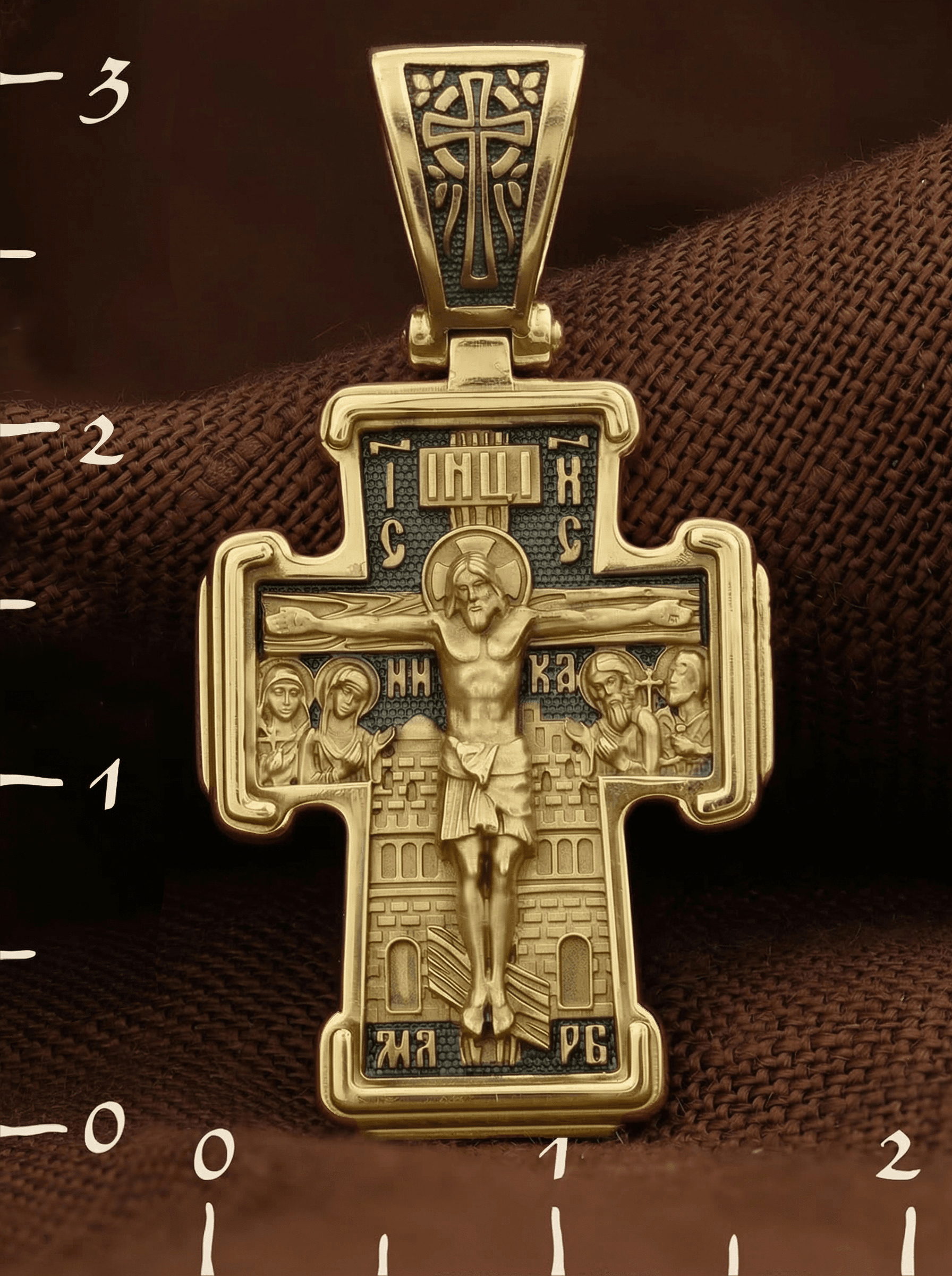 На лицевой стороне креста изображено Распятие Господа и Спасителя нашего Иисуса Христа. Крест- символ спасения и искупления рода человеческого, знамение победы над смертью и адом. Иисус Христос, как искупительная жертва освобождения человечества от власти греха, умер крестной смертью и в третий день воскрес. На верхней табличке, выше головы Иисуса, расположена надпись, составленная Понтием Пилатом — «IНЦI». Она означает «Иисус Назорей, Царь Иудейский». Рядом расположена надпись «IС» « ХС». Она означает Иисус Христос. Ниже — слово «НИКА», что означает «победитель». Слева от Распятия — Пресвятая Богородица и святая мироносица Мария Магдалина с крестом в руке. Справа — апостол и евангелист Иоанн Богослов, один из ближайших учеников Иисуса Христа, и сотник Лонгин с крестом в правой руке и копьем — в левой. За крестом высится Иерусалимская стена. Надпись «МЛРБ» — «место лобное рай бысть» означает, что место лобное стало раем, помещается в нижней части креста. На кулонном кольце помещен крест.