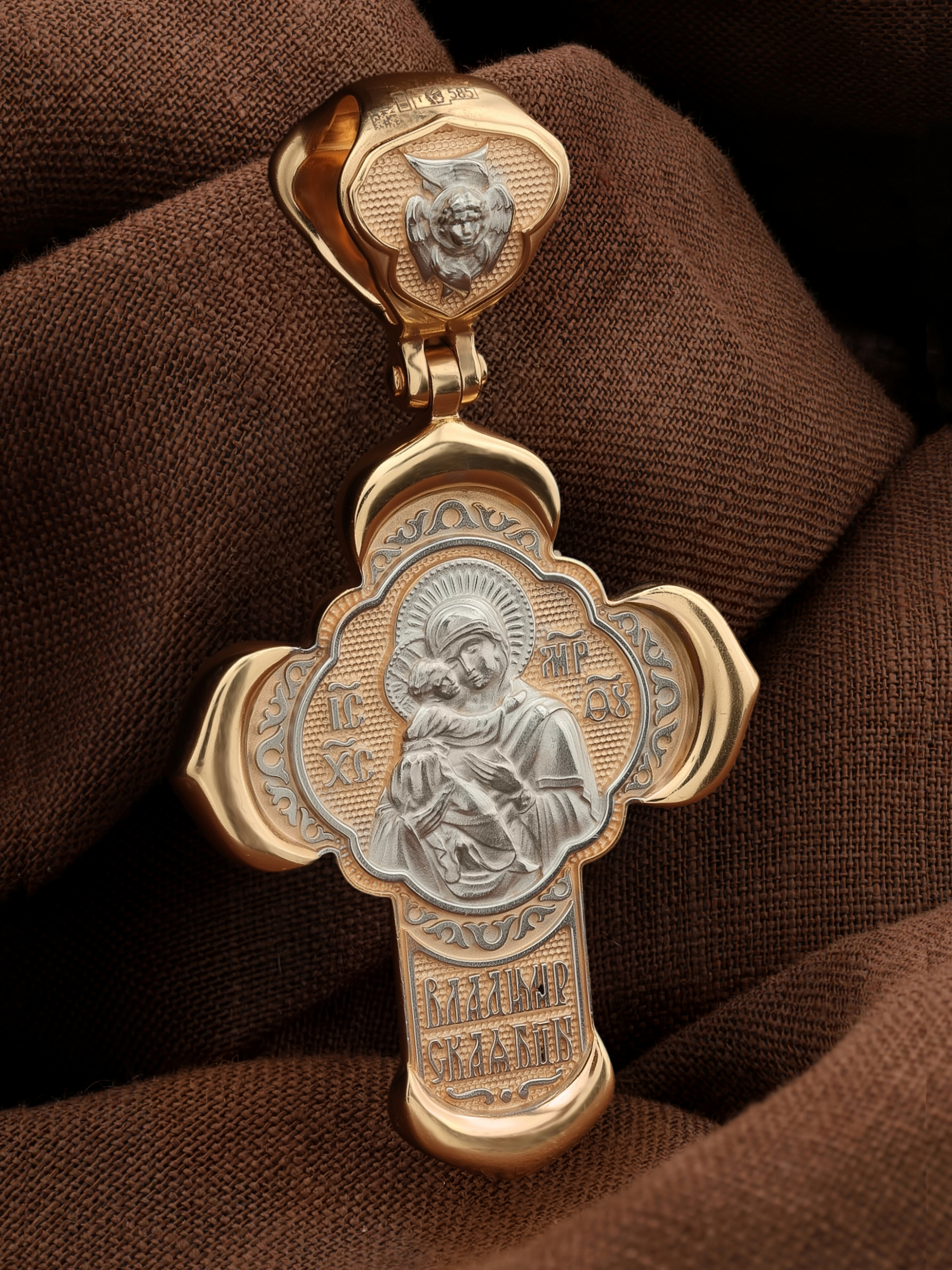 В центре оборотной стороне креста помещен образ Владимирской иконы Божией Матери — один из самых чтимых святынь Русской православной церкви. По преданию, икона была написана Святым апостолом и евангелистом Лукой во время земной жизни Богородицы. Икона Владимирской Божией Матери вплоть до V века находилась в Иерусалиме, затем была перевезена в Византию. На Русь икона была привезена в 1131 г. За прошедшие столетия святыня неоднократно переезжала из Владимира в Москву и обратно, не раз спасая страну от захватчиков. Русская Православная Церковь установила троекратное празднование Владимирской иконе Божией Матери. Каждый из дней празднования связан с избавлением русского народа от порабощения иноплеменниками по молитвам ко Пресвятой Богородице