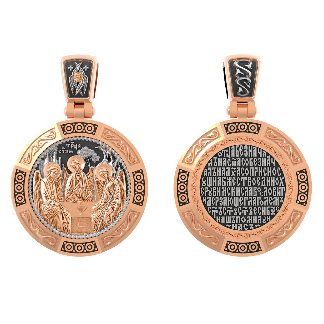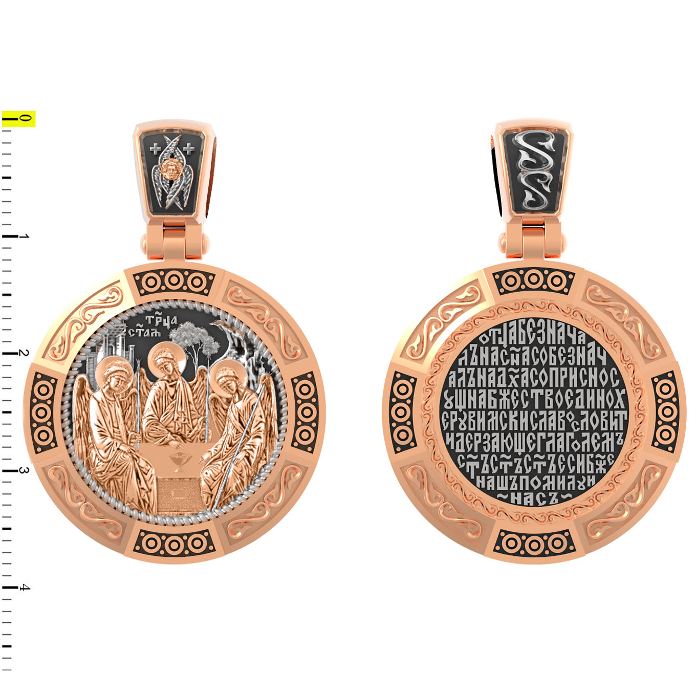 На лицевой стороне изображена икона Святой Троицы. Это образ Триединого Бога явившегося в виде трех Ангелов праотцу Аврааму. Ангелы сидят за трапезным столом вокруг чаши, которая символизирует грядущую жертву Второго Лица Пресвятой Троицы, Бога Сына.