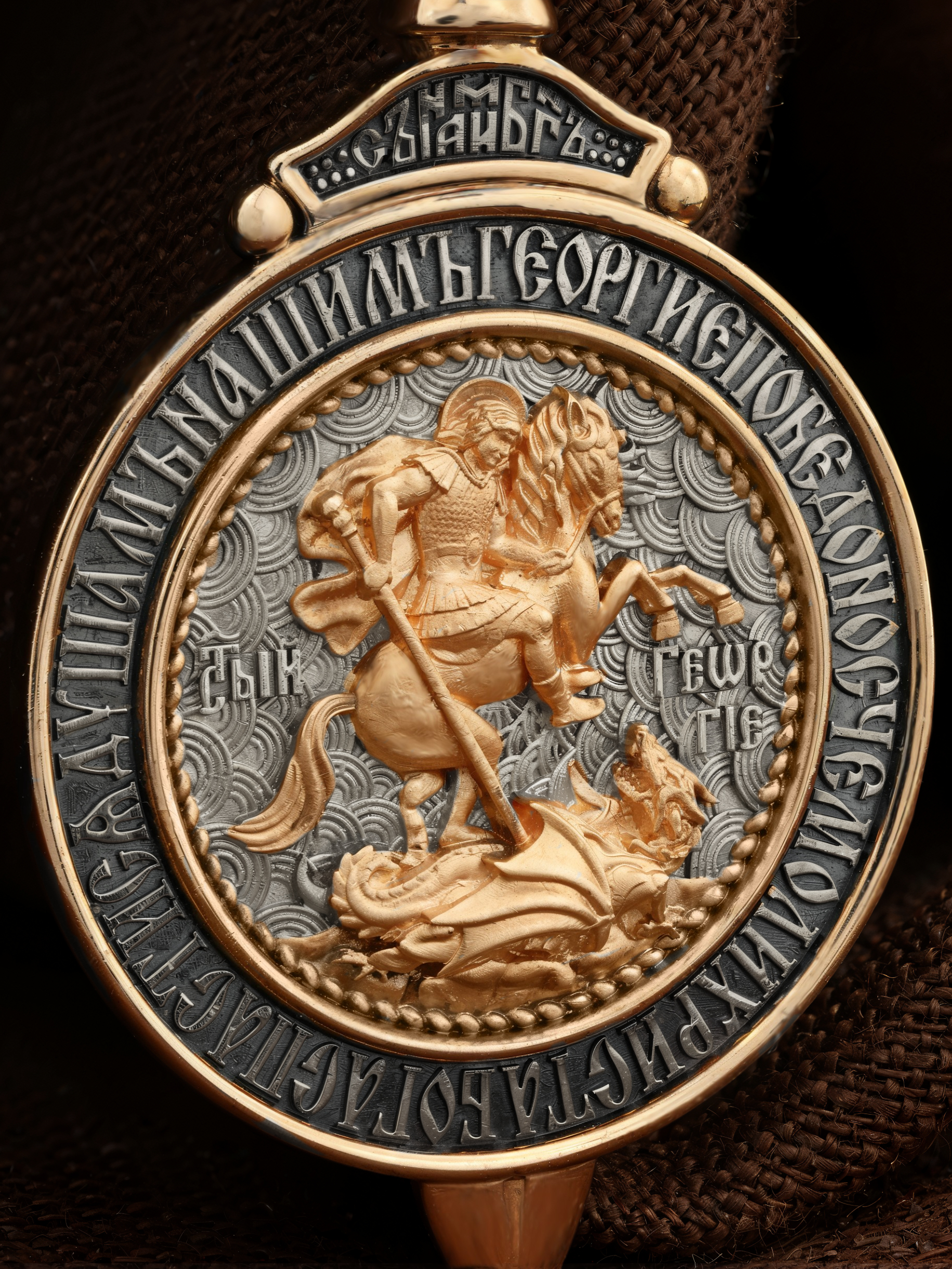 Основой композиции лицевой стороны является изображение Святого Великомученика Георгия Победоносца — одного из самых почитаемых и удивительных святых. На Руси он известен как Юрий или Егорий, покровитель воинов, помощник в крестьянском труде. На образке он изображен как воитель, сидящий на вздыбленном коне и поражающий копьем огнедышащего змея. Змей символизирует собою сатанинские силы. Молитвами вознесенными к Всевышнему и своей непреклонной верой он смог одолеть чудовище. Святой убил змея, спас царскую дочь, принесенную в жертву, и жителей города, их души от влияния дьявола, породив в них надежду и веру в Господа, призывая людей принять христианскую веру. Изображение святого великомученика Георгия Победоносца обрамлено словами молитвы: «Геогрие Победоносче, моли Христа Бога спастися душам нашим».