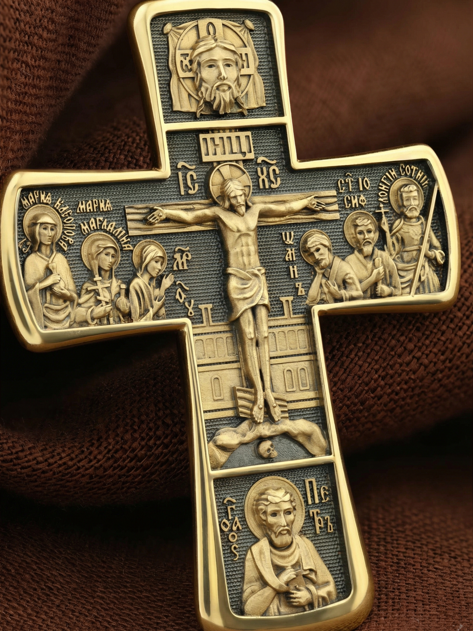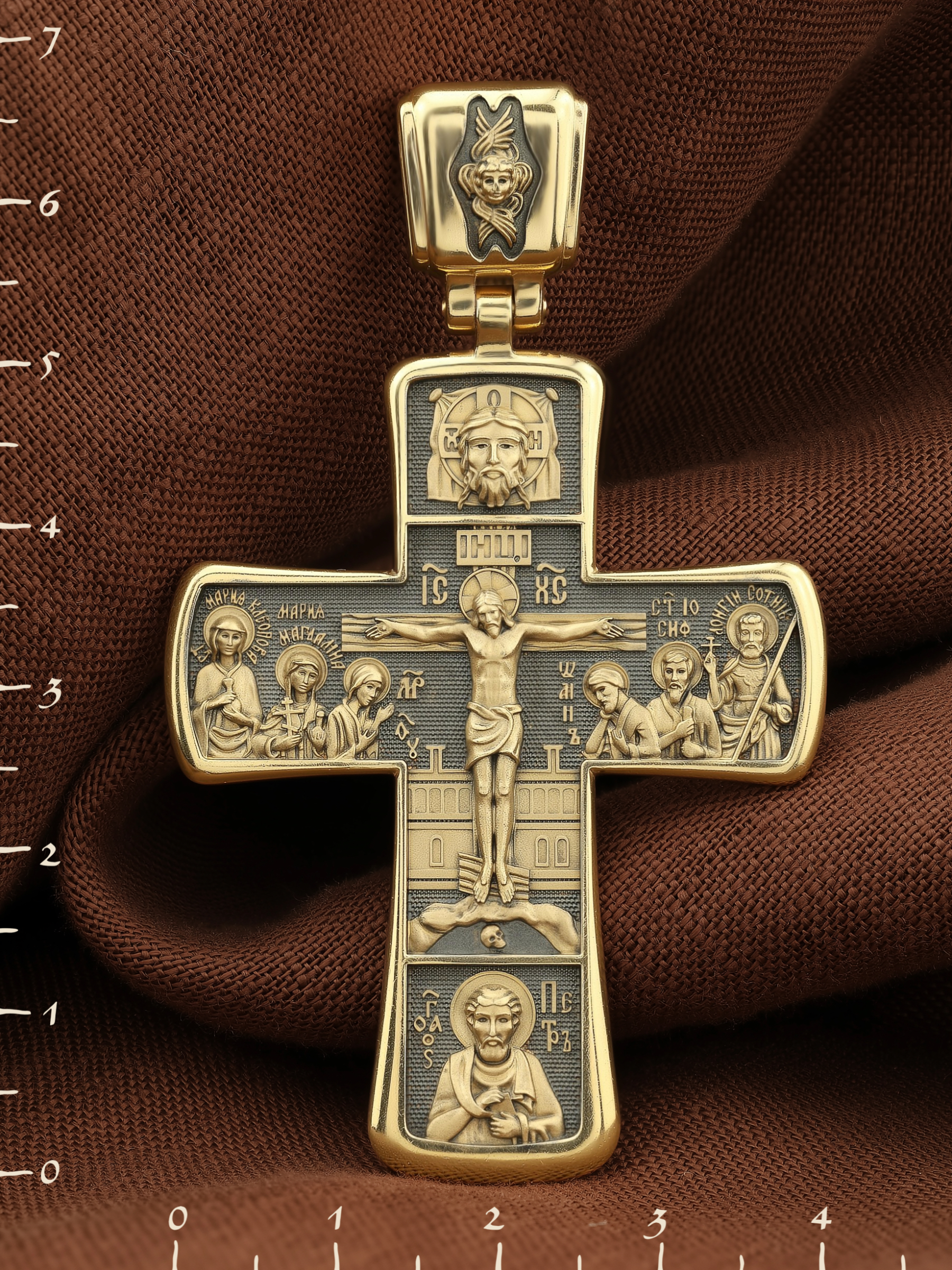 На лицевой стороне креста изображено Распятие Господа Иисуса Христа с предстоящими Ему святыми, которые, по преданию, находились у Креста Господа во время Его казни. Слева — Пресвятая Богородица и жены-мироносицы — равноапостольная Мария Магдалина и святая Мария Клеопова, справа — апостол Иоанн Богослов, прав. Иосиф Аримофейский и мч. Лонгин Сотник.
