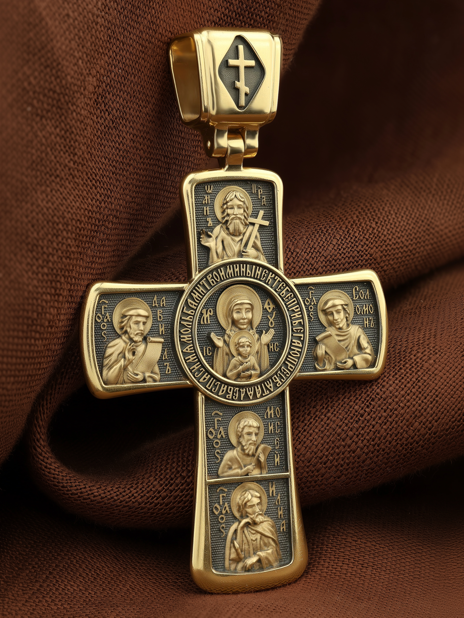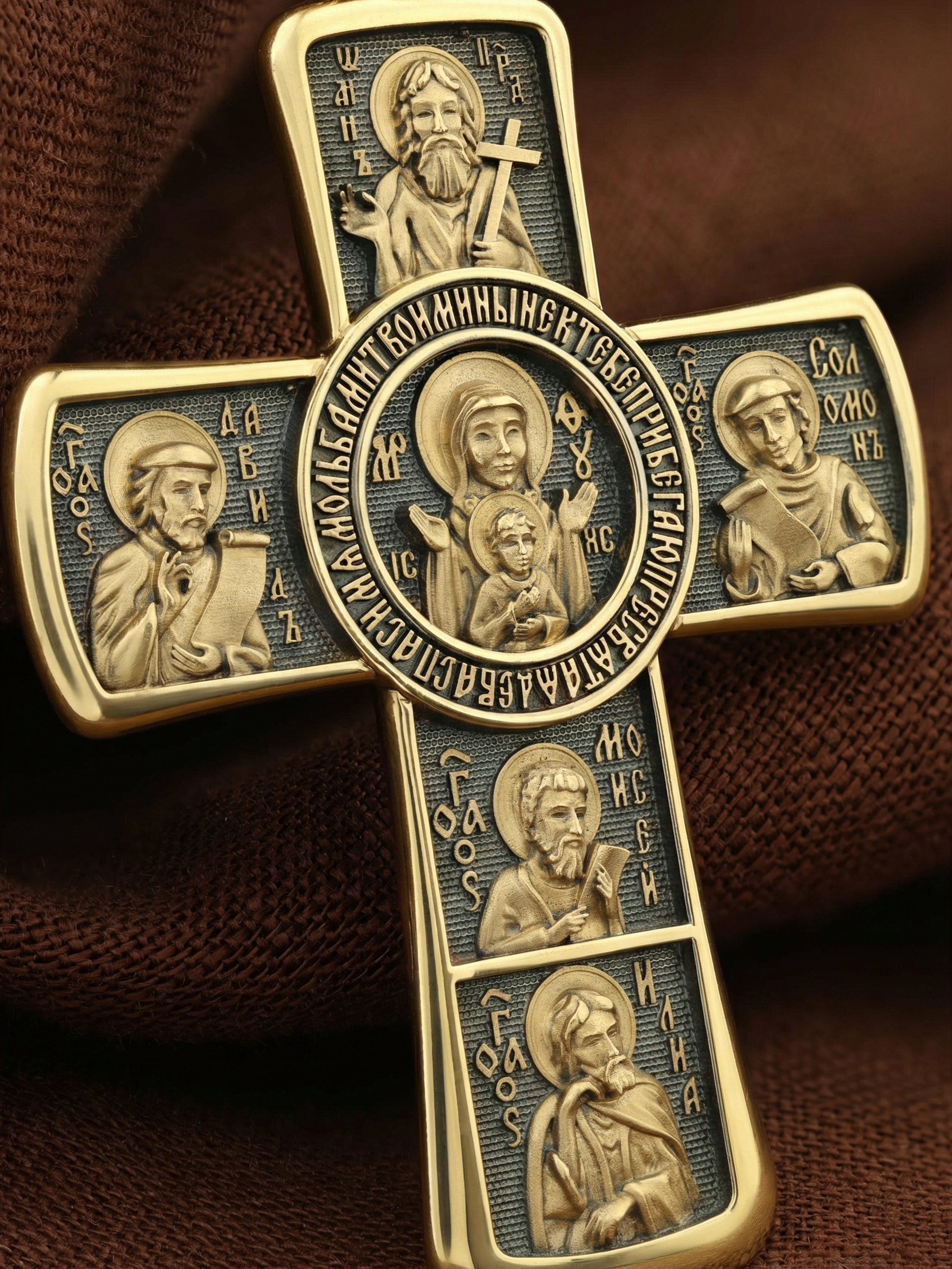 Центральную часть оборота креста украшает икона Божией Матери «Знамение». Вокруг Ее образа написана молитва: «Ныне к Тебе прибегаю, Пресвятая Дева, спаси мя мольбами Твоими».