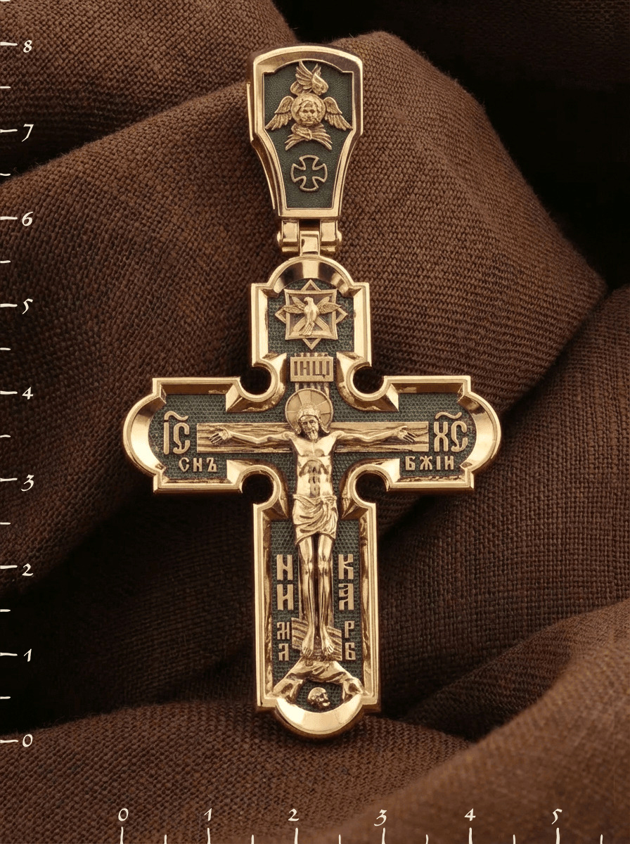 На лицевой стороне креста изображено Распятие Господа и Спасителя нашего Иисуса Христа. Христос, подвергнутый на кресте мучительной казни, своими страданиями искупил нас от древнего греха и даровал нам жизнь вечную. На верхней табличке, выше головы Иисуса, расположена надпись, составленная Понтием Пилатом — «IНЦI». Она означает «Иисус Назорей, Царь Иудейский». Надпись «IС ХС» означает Иисус Христос и словосочетание «СЫН БОЖИЙ», что означает божественную природу Иисуса Христа, помещается на разных сторонах поперечной перекладины креста. В нижней части креста находятся надписи –«НИКА» и «МЛРБ». В переводе с греческого, слово «НИКА» означает «победитель». Именно оно является символом победы Христа над смертью. Надпись «МЛРБ» — «место лобное рай бысть» означает, что место лобное стало раем. Крест стоит на горе камней, символизирующих Голгофу. Под подножием Креста изображена покоящаяся голова (череп) Адама, грехи которого Христос омыл Своею Кровью. Христос в Своей Божественной любви, над которой смерть не властна и которая, страдая, и не страдает в обычном смысле, простирает к людям со Креста Свои объятия, в которые призывается и привлекается весь мир. Поэтому Тело Его не висит, а торжественно покоится на Кресте.