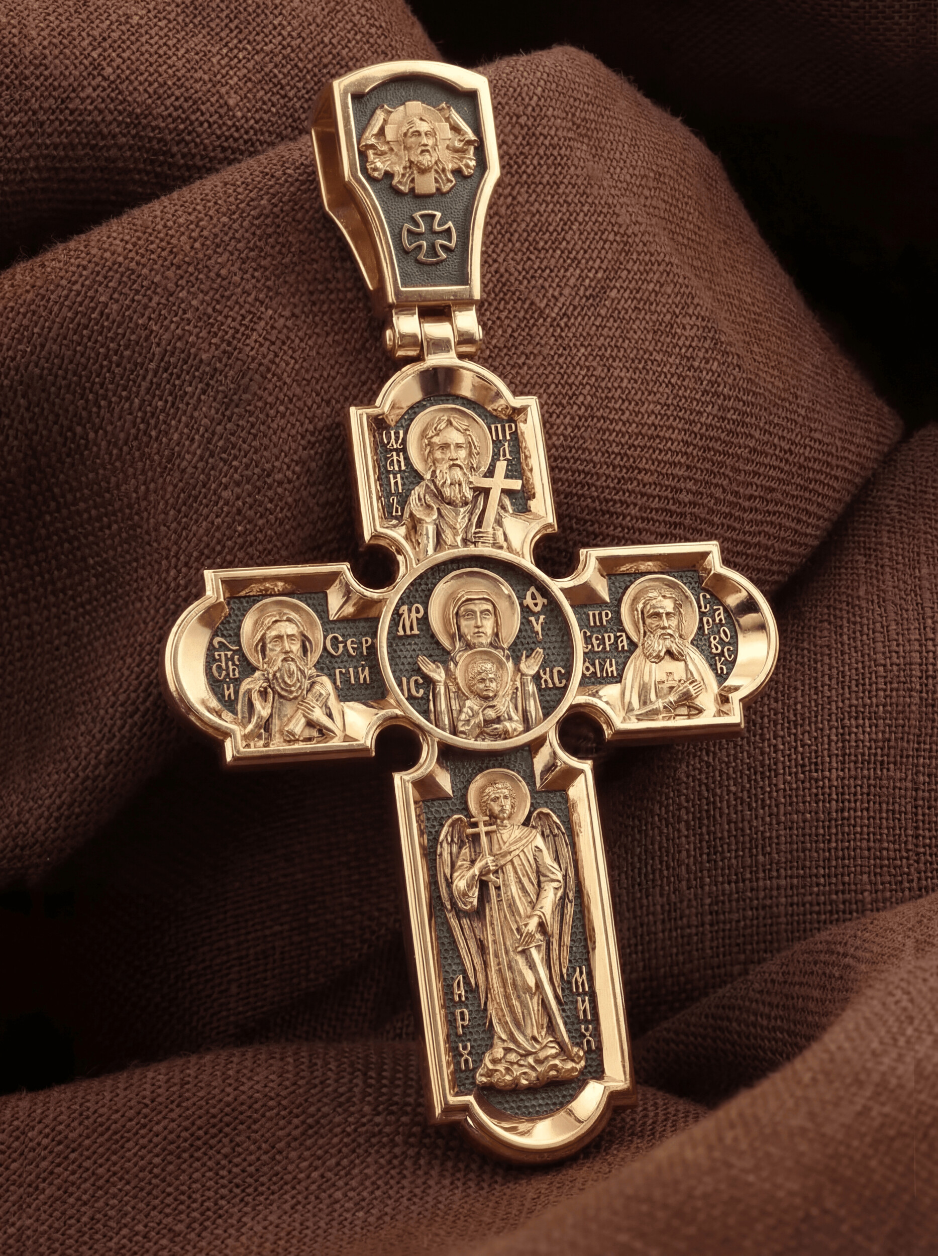Центральную часть оборотной стороны креста украшает икона Божией Матери «Знамение». Иконы Божией Матери, известные под именем «Знамение», появились на Руси в XI — XII веках, а называться так стали после чудесного знамения от Новгородской иконы, случившегося в 1170 году. Многочисленные списки с иконы Знамения известны по всей России. Многие из них просияли чудесами в местных храмах и были наименованы по месту явления чудес. На кресте внизу изображен Архангел Михаил, слева — Преподобный Сергий Радонежский, справа — Преподобный Серафим Саровский, вверху  — Предтеча Господень Иоанн Креститель. На кулонном кольце помещено изображение Спаса Нерукотворного — образ Спасителя, который Он запечатлел на плате и передал для исцеления больному проказой царю Эдессы. Ему придается победное и защитное значение.