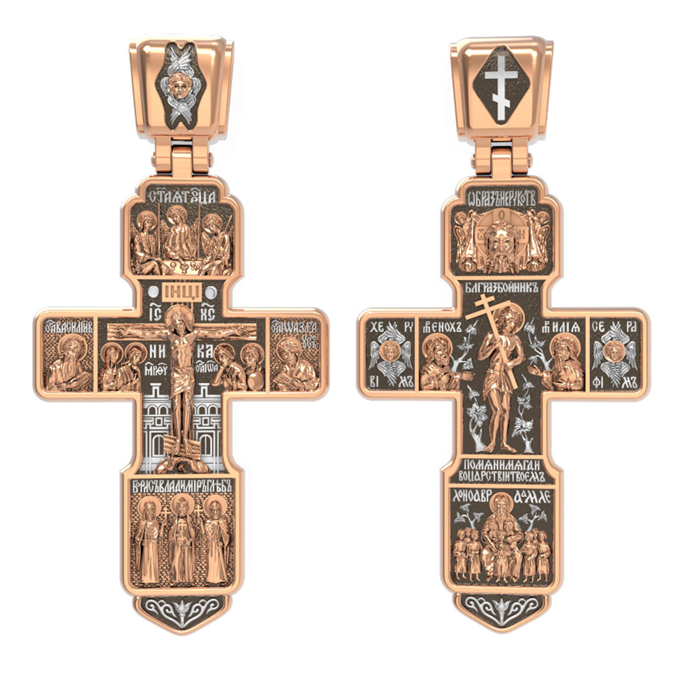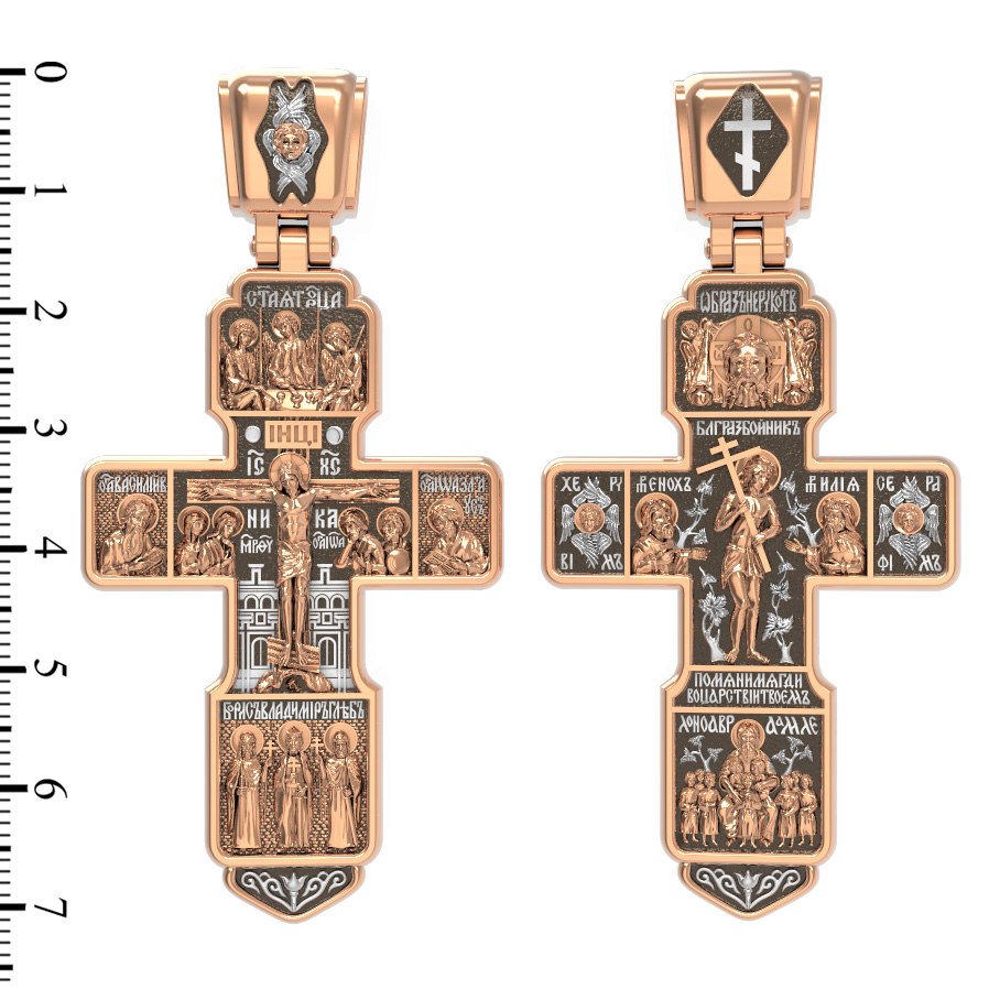 На концах горизонтальной балки креста помещены образы вселенских святителей и творцов литургии Василия Великого и Иоанна Златоуста. В кулонном кольце изображены райские врата с их стражем — Херувимом. Врата, которые открылись благодаря крестной жертве Христа.