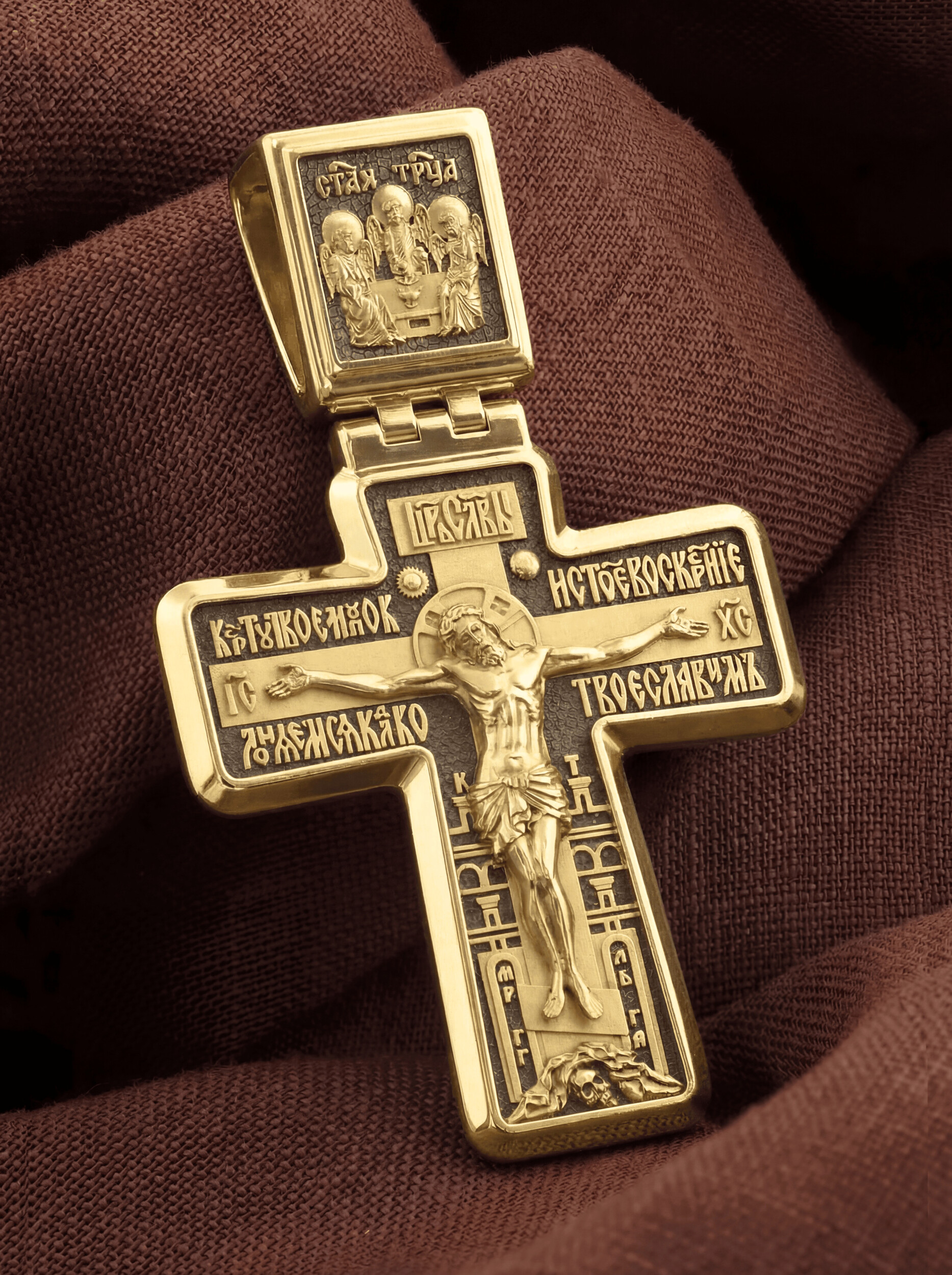 На лицевой стороне креста изображено Распятие Иисуса Христа. Позади Его изображена иерусалимская стена, знак того, что Господь был распят вне стен города. Но вместе с тем стена знаменует и Небесный Иерусалим, путь в который открылся для человечества через Голгофу: «МЛРБ», «Место Лобное Рай Бысть» — написано у ее основания. Рядом с Его образом помещены слова «Царь Славы». Эти слова характеризуют Господа как Великого Архиерея, победителя смерти. Верхняя перекладина символизирует титло — табличку, на которой, согласно Евангелию, было начертано: «Иисус Назорей Царь Иудейский» (IНЦI). Также Распятие сопровождается надписями, олицетворяющими Христа. Это святое имя Христа «IC» (Иисус) «ХС» (Христос), и словосочетание «Сын Божий», а так же написан тропарь Животворящему Кресту: «Кресту Твоему поклоняемся, Владыко, и святое воскресение Твое славим». Распятие стоит на горе камней, символизирующих Голгофу, в основании которой различается череп. Это голова Адама. На кулонном кольце помещено изображение Святой Троицы.