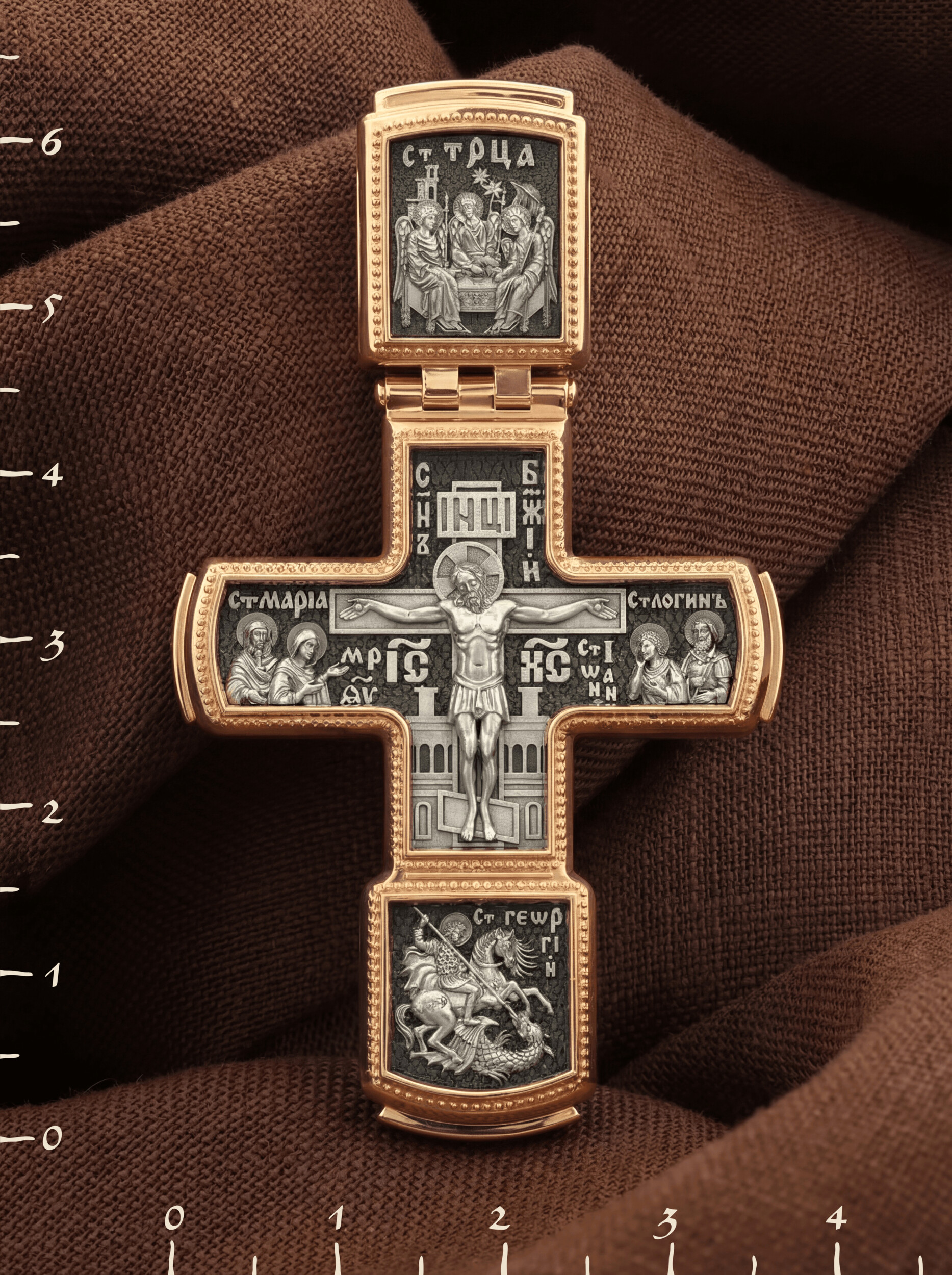 На кресте изображено Распятие Господа нашего Иисуса Христа. Ему предстоят Святая Мария Магдалина, Пресвятая Богородица, апостол Иоанн и Святой Иосиф, свидетели крестных страданий Господа. На оглавии помещена икона Святой Троицы, на которой запечатлено явление Триединого Бога праотцу Аврааму в виде трех ангелов. В нижнем клейме изображено Чудо Святого Георгия о змие. Великомученик Георгий почитается как покровитель воинов, защитник от злых сил, помощник в духовной борьбе.