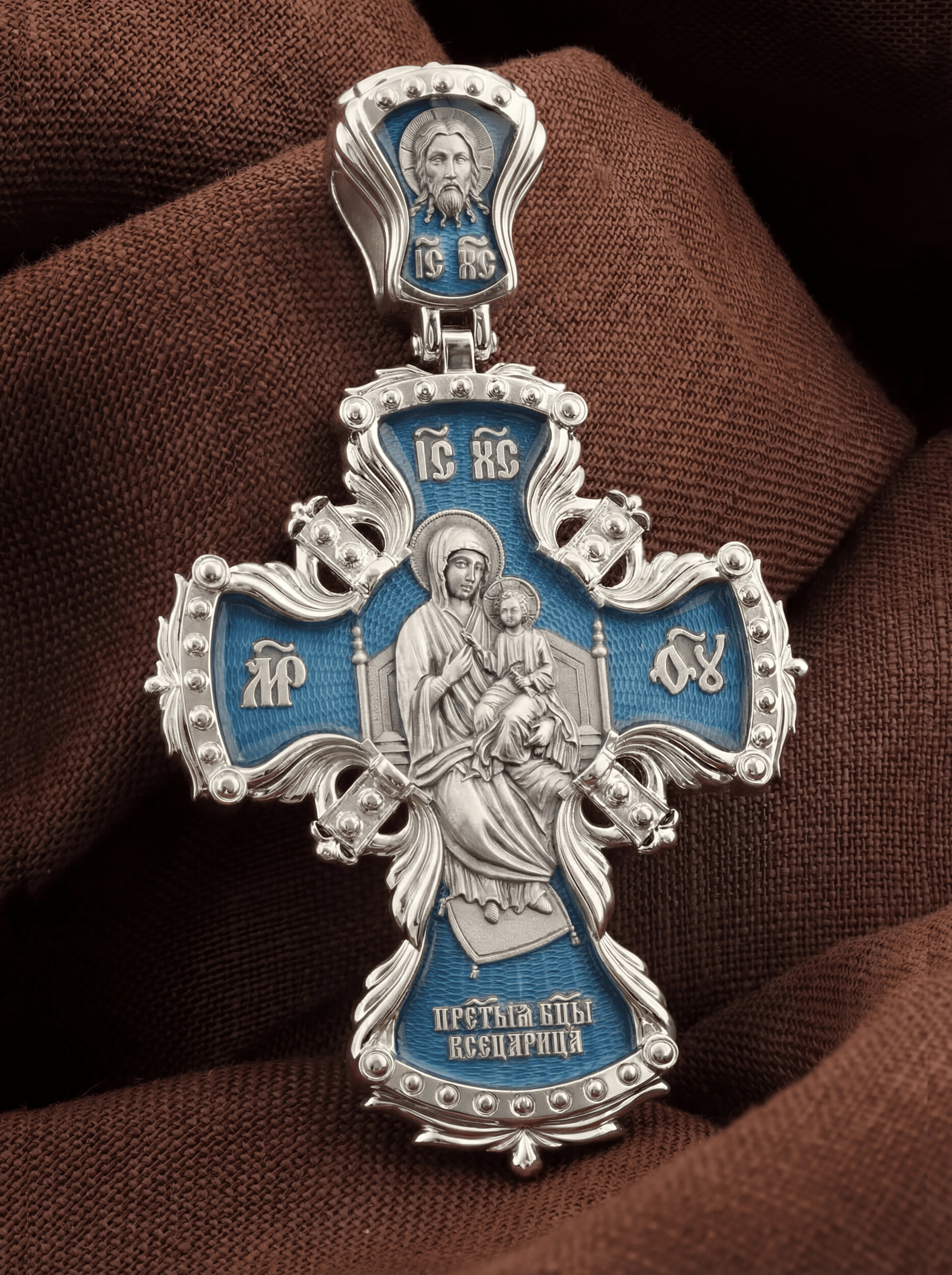 Основной композицией оборота креста является образ Божией Матери «Всецарица», восседающая на царском троне. На руках Ее — Богомладенец Иисус Христос со свитком в левой руке. Пальцы Его правой руки сложены в благословляющем жесте.