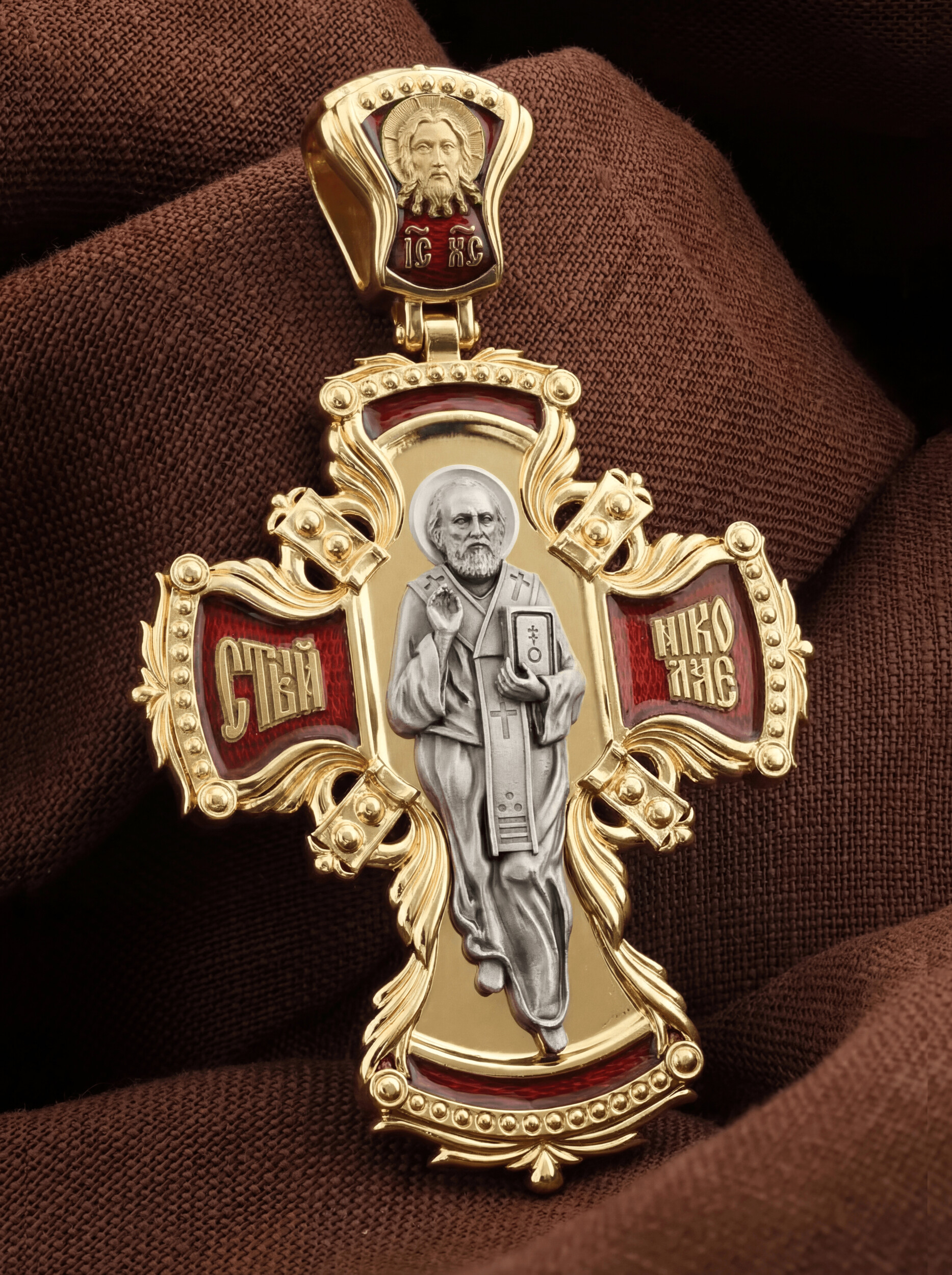 Оборотную сторону креста возглавляет икона святителя Николая Чудотворца, самого почитаемого святого не только в России, но и во всем мире. Николай Чудотворец, помощник в делах, защитник путешествующих, покровитель учащихся, утешитель обиженных и нуждающихся, целитель самых страшных и тяжелых недугов, предстатель и молитвенник за людей перед Богом. На кулонном кольце помещено изображение Спаса Нерукотворного — образ Спасителя, который Он запечатлел на плате и передал для исцеления больному проказой царю Эдессы.