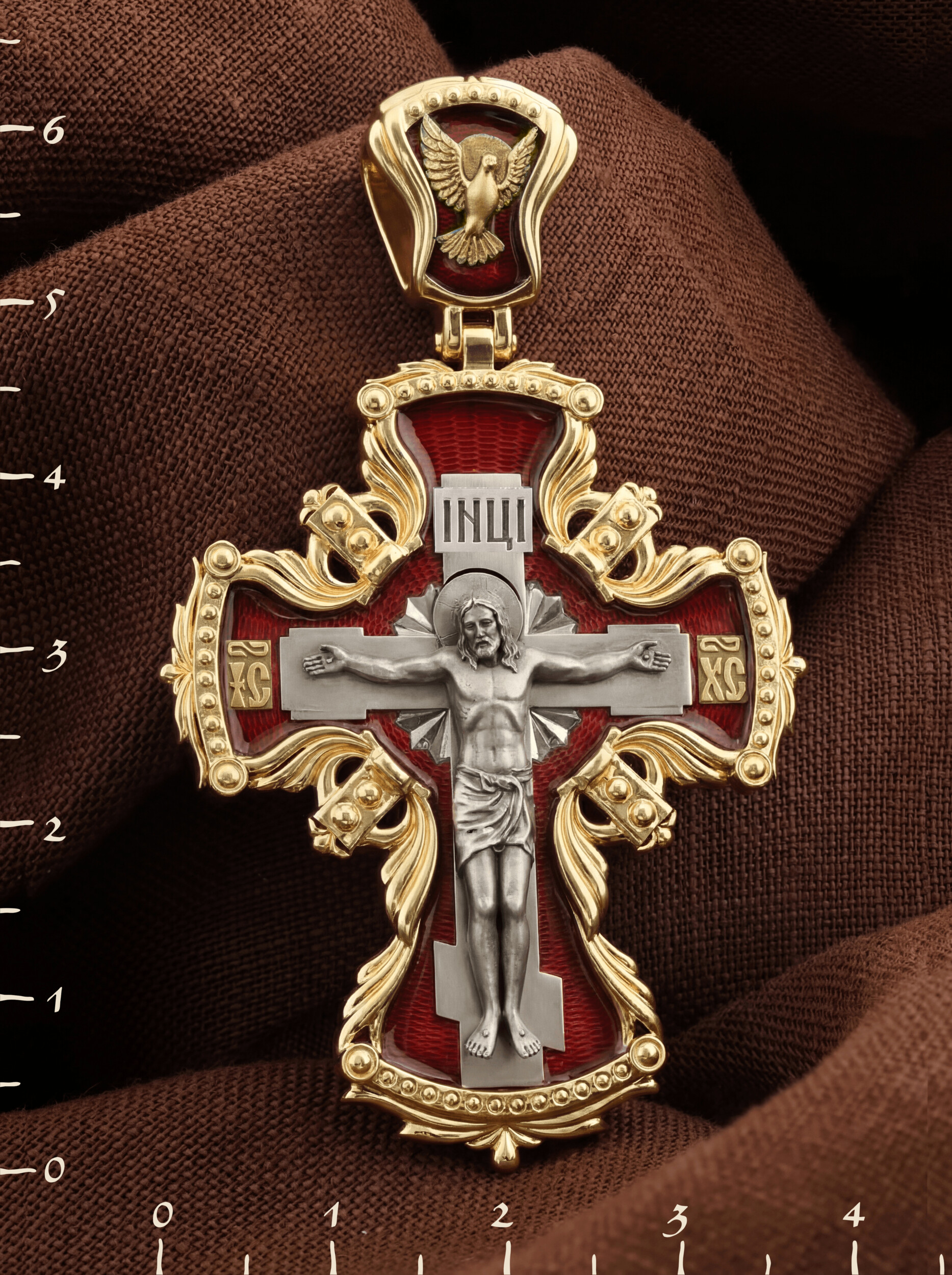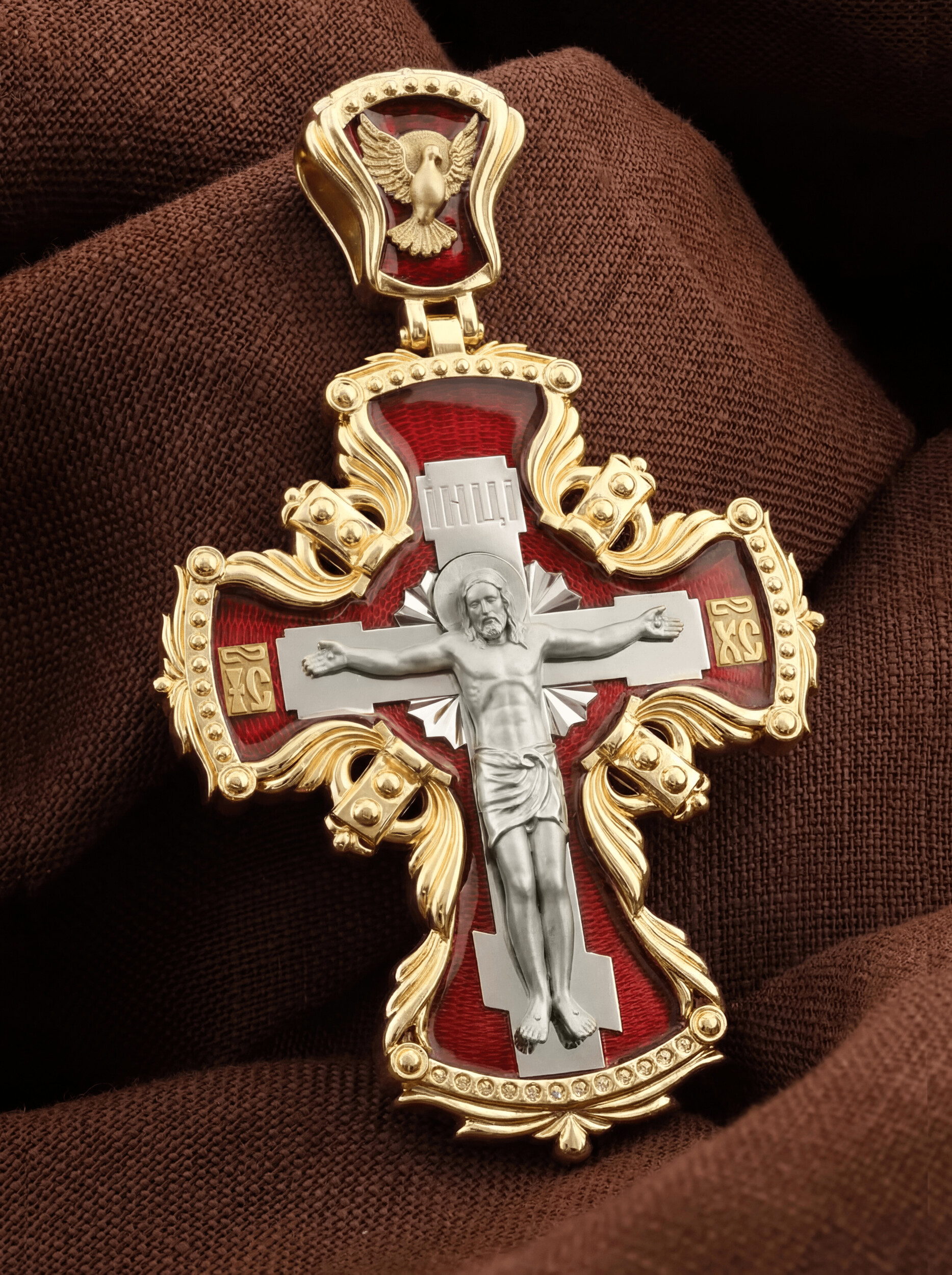 Центральную часть лицевой стороны занимает Распятие Христа — образ жертвы, принесенной Господом за грехи людей. Именно ко Христу, сошедшему на землю ради нашего спасения, возносятся все молитвы. Рядом с Его образом помещены слова — «НИКА» и «СЫН БОЖИЙ». Эти слова характеризуют Господа как Великого Архиерея, победителя смерти. Также Распятие сопровождается надписями, олицетворяющими Христа — это святое имя Христа «IC» (Иисус) «ХС» (Христос). На кулонном кольце изображен голуь — символ Святого Духа.