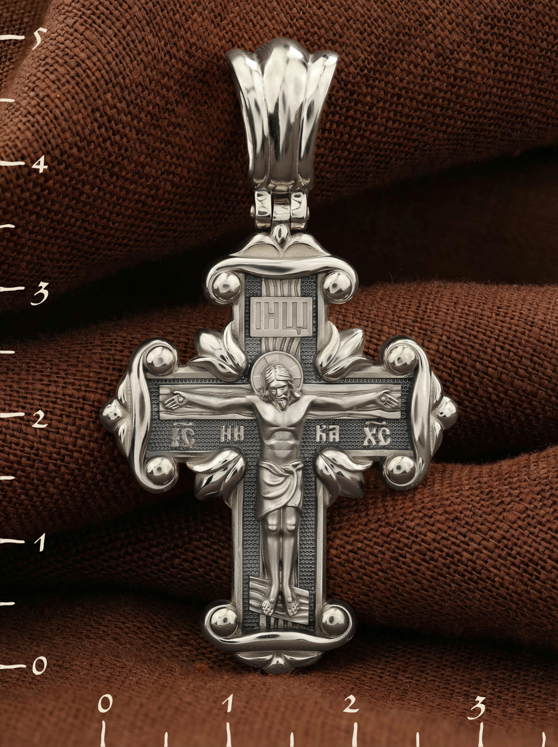 На лицевой стороне креста изображено Распятие Господа и Спасителя нашего Иисуса Христа, отдавшего Себя на смерть, для искупления грехов мира. Крест является символом жертвенной любви Всеблагого Бога к падшим людям, всепобеждающим духовным оружием христиан, основанием и средоточием церковной жизни. Господь сказал: кто хочет идти за Мною, отвергнись себя, и возьми крест свой, и следуй за Мною. (Мк. 8: 34). На верхней табличке, выше головы Иисуса, расположена надпись, составленная Понтием Пилатом — «IНЦI». Она означает «Иисус Назорей, Царь Иудейский». Надпись «IC» «ХC», означает Иисус Христос, помещается на разных сторонах поперечной перекладины креста. Рядом — слово «НИКА», что означает «победитель». На православном кресте Христос не умирает, а свободно простирает руки, ладони Иисуса открыты, будто он хочет обнять все человечество, даря им свою любовь и открывая путь к вечной жизни.