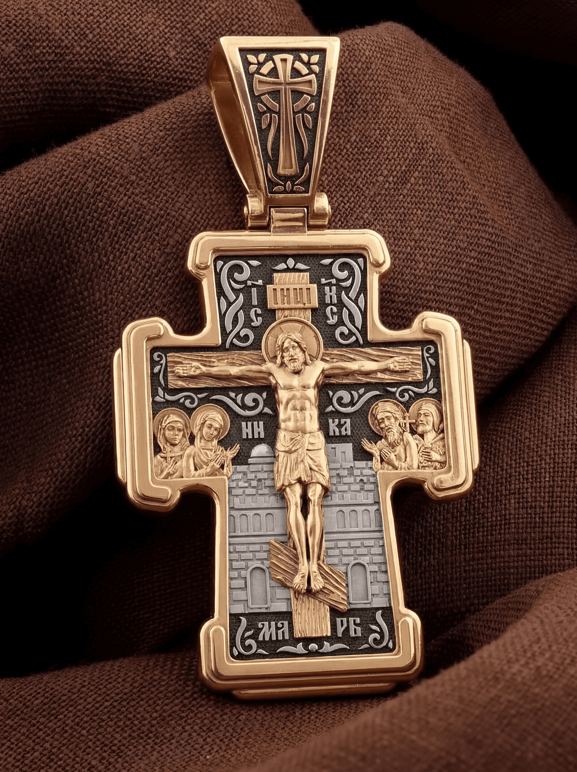 На лицевой стороне креста изображено Распятие Господа и Спасителя нашего Иисуса Христа. Крест- символ спасения и искупления рода человеческого, знамение победы над смертью и адом. Иисус Христос, как искупительная жертва освобождения человечества от власти греха, умер крестной смертью и в третий день воскрес. На верхней табличке, выше головы Иисуса, расположена надпись, составленная Понтием Пилатом — «IНЦI». Она означает «Иисус Назорей, Царь Иудейский». Рядом расположена надпись «IС» « ХС». Она означает Иисус Христос. Ниже — слово «НИКА», что означает «победитель». Слева от Распятия — Пресвятая Богородица и святая мироносица Мария Магдалина с крестом в руке. Справа — апостол и евангелист Иоанн Богослов, один из ближайших учеников Иисуса Христа, и сотник Лонгин с крестом в правой руке и копьем — в левой. За крестом высится Иерусалимская стена. Надпись «МЛРБ» — «место лобное рай бысть» означает, что место лобное стало раем, помещается в нижней части креста. На кулонном кольце помещен крест.