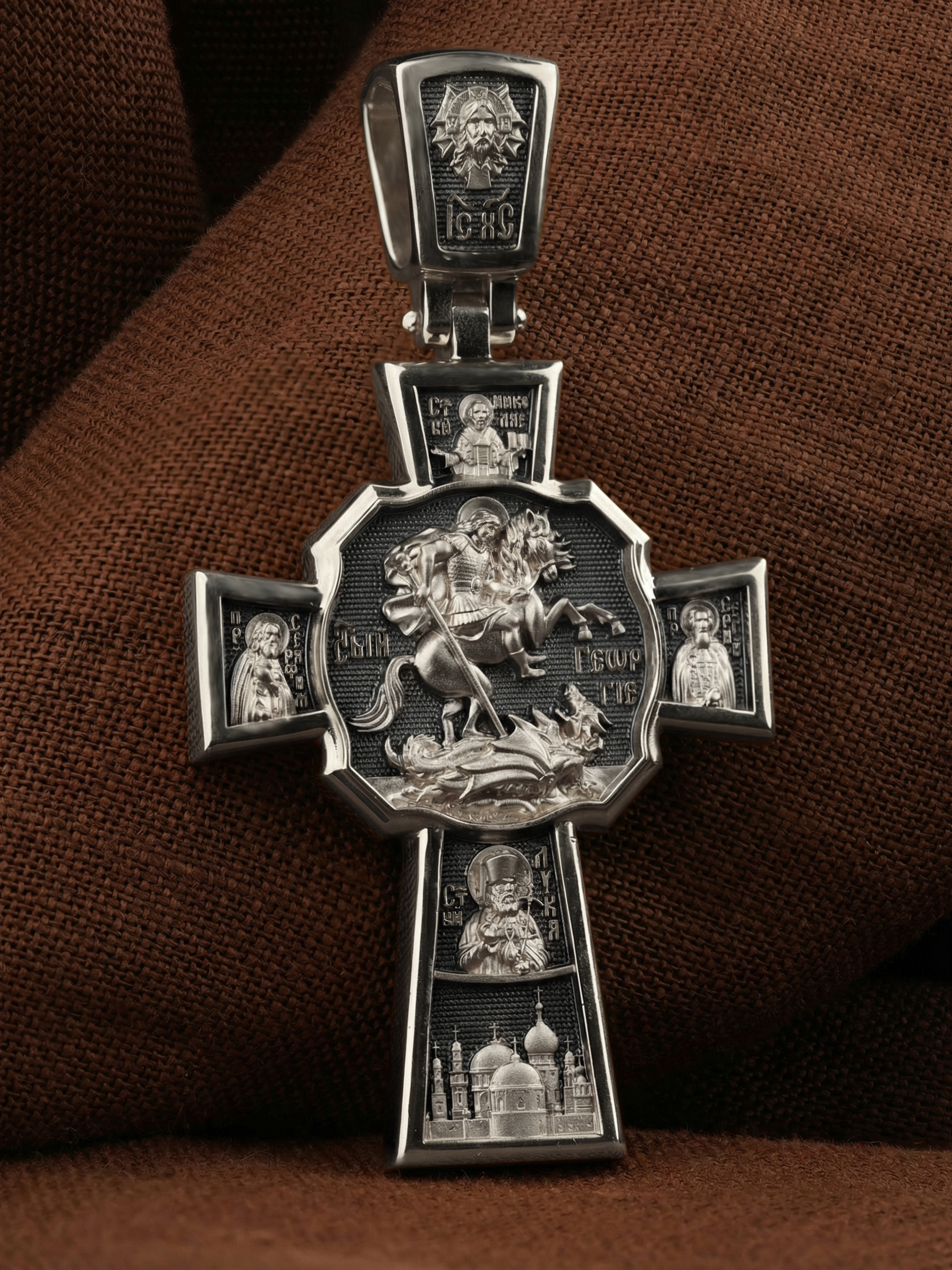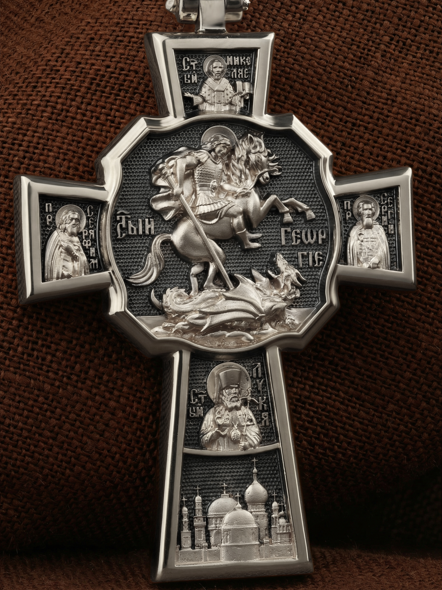 В центре оборотной стороне креста помещен образ Святого Великомученика Георгия Победоносца — одного из самых почитаемых и удивительных святых. На образке он изображен как воитель поражающий копьем огнедышащего змея. Змей символизирует собою сатанинские силы. Справа помещен образ Святого Преподобного Сергия, игумена Радонежского, чудотворца, слева — Преподобного Серафима Саровского, чудотвореца. Выше помещен образ Святителя Николая архиепископа Мир Ликийских, чудотвореца, ниже — образ святителя Луки (Войно-Ясенецкого), архиепископа Симферопольского и Крымского, исповедника и изображение Храма. На кулонном кольце изображен Спас Нерукотворный — образ Господа и Спасителя нашего Иисуса Христа, чудесно отпечатавшийся на плате, котором Христос вытер свой лик.