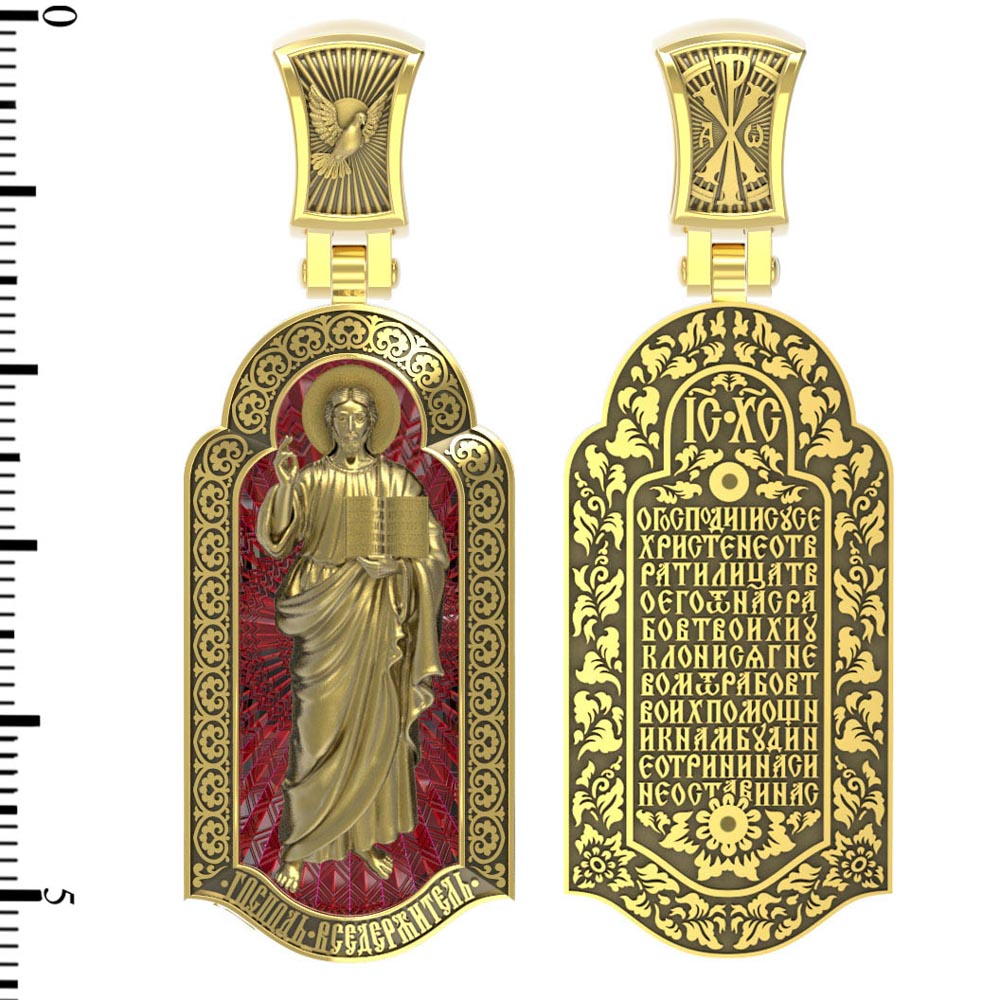 На лицевой стороне креста изображен Иисус Христос в образе Вседержителя, по-гречески «Пантократор». Это древнейший образ Спасителя, на котором Он представлен как властелин и правитель мира. Христос держит в руках Книгу, которая символизирует Книгу Бытия, то есть весь сотворенный Богом мир. В этой Книге судьбы всех людей, живущих на земле. Часто эту Книгу образно называют Книгой Жизни. Первое дошедшее до нас подобное изображение датируется VI веком и хранится в монастыре Святой Екатерины на горе Синай. Такие образы Христа с глубокой древности писались и в Палестине. Но Святая земля так часто подвергалась разграблению завоевателями, что древних икон там не осталось. Большинствоикон в храме Воскресения Христова были созданыв XIX веке.
