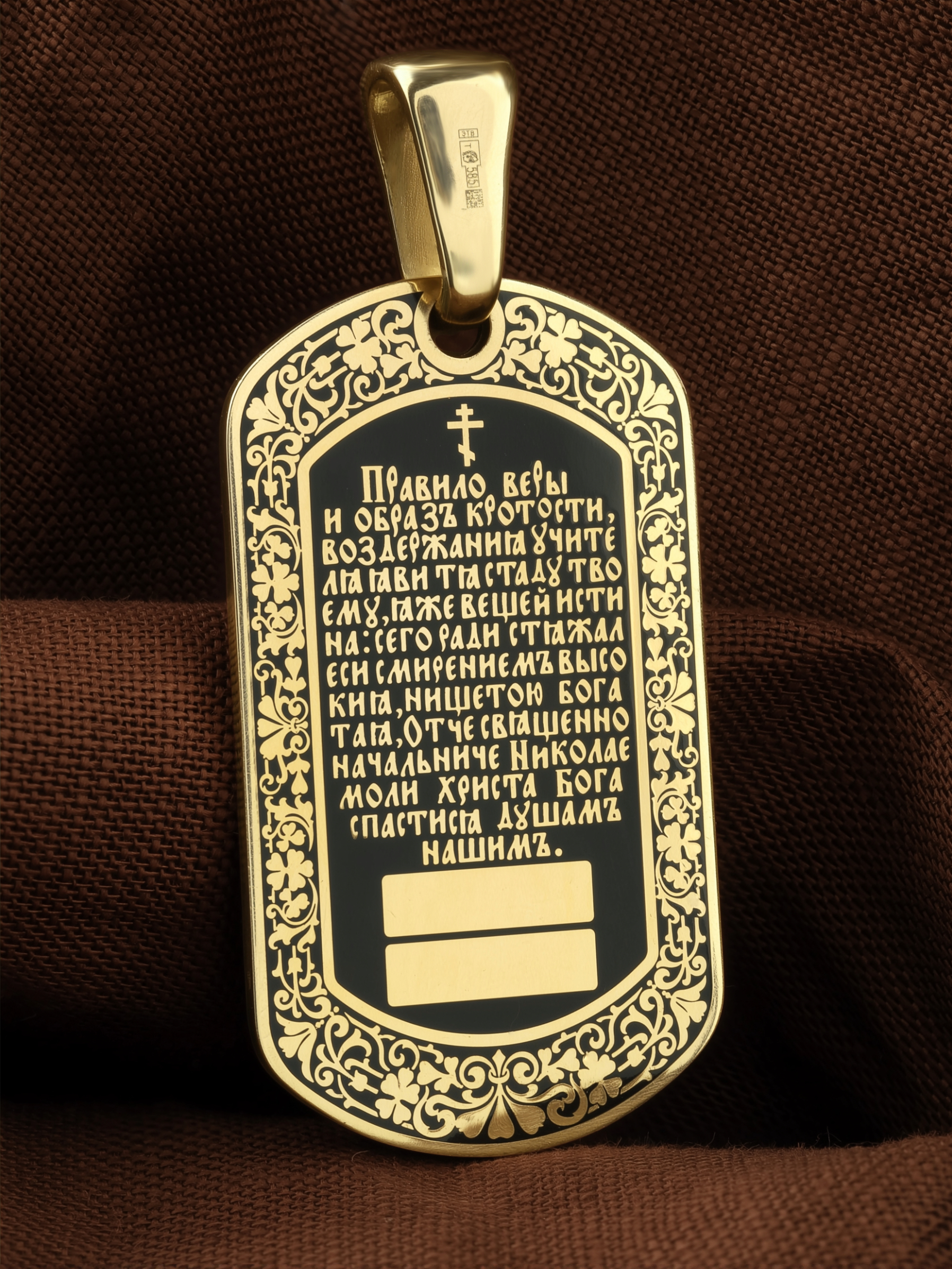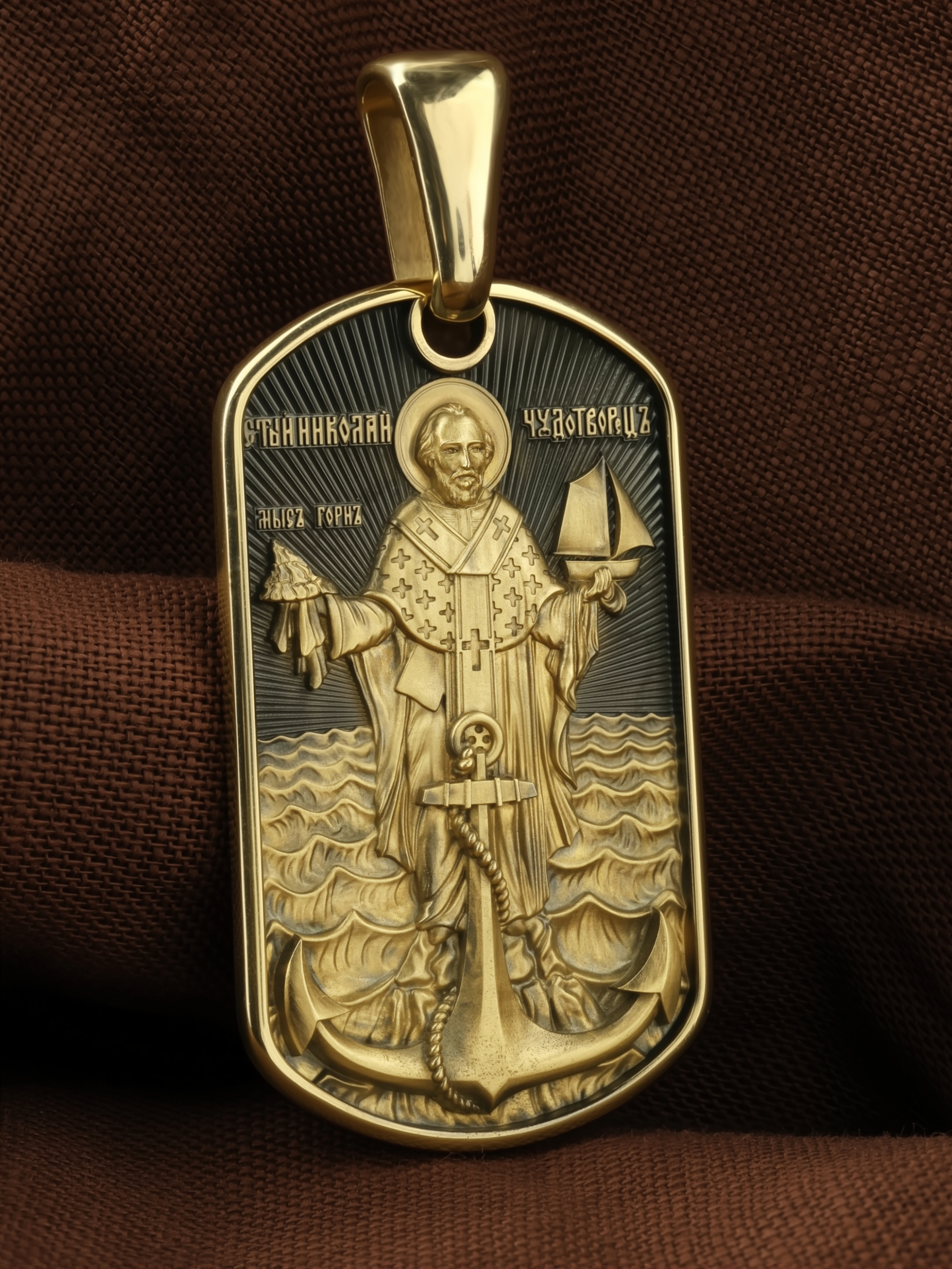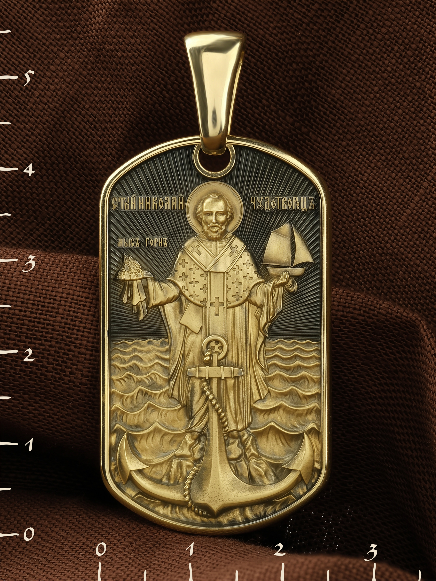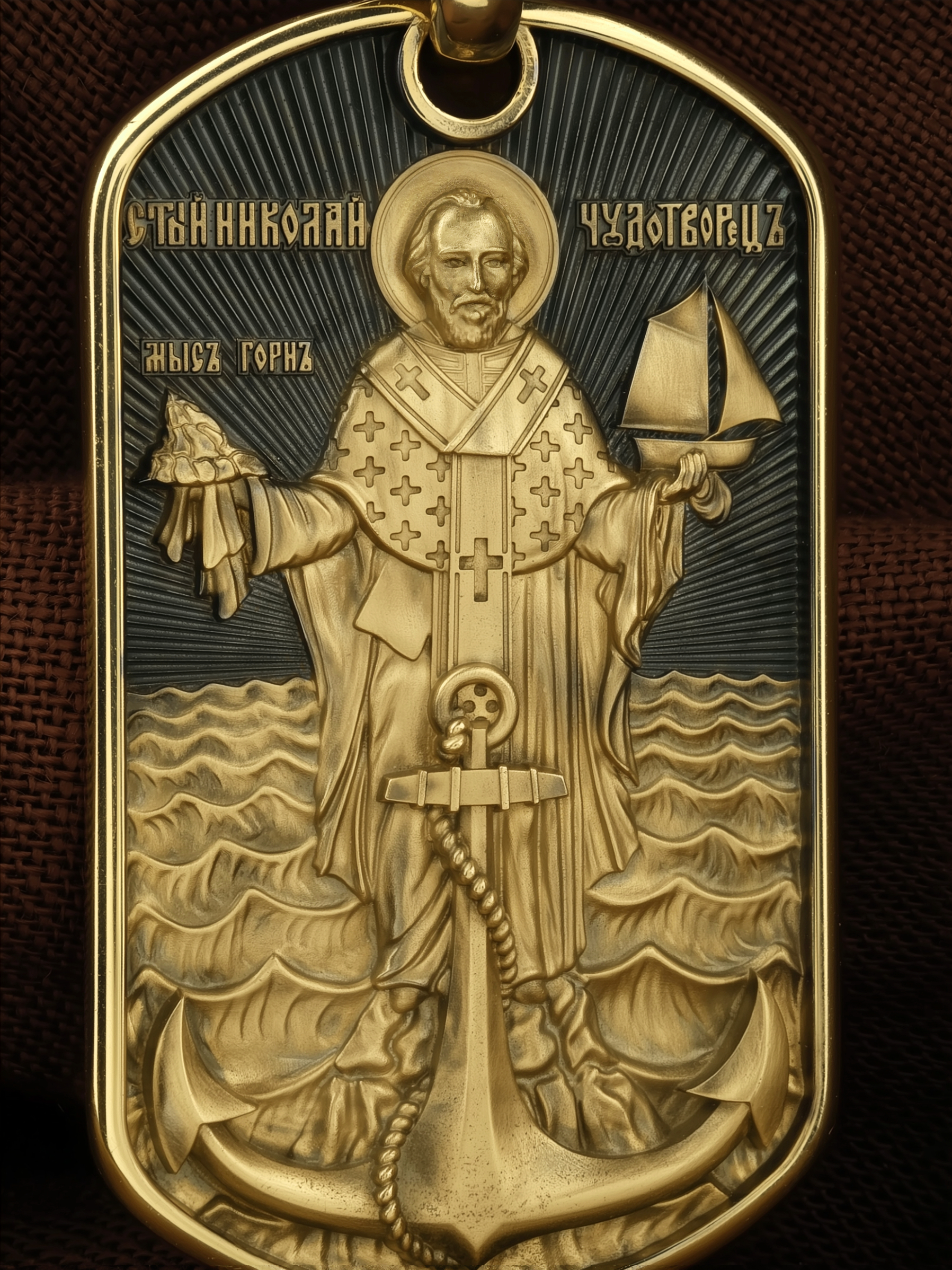 Лицевую сторону возглавляет икона Святителя Николая Чудотворца. Живший в III веке епископ Ликийского города Миры — самый почитаемый святой не только в России, но и во всем мире. Николай Чудотворец, помощник в делах, покровитель учащихся, утешитель обиженных и нуждающихся, целитель самых страшных и тяжелых недугов, предстатель и молитвенник за людей перед Богом. Также Святитель Николай Чудотворец известен своими молитвами за путешественников, когда непрестанный ветер и бушующие волны утихают и корабль заходит в спокойную гавань.