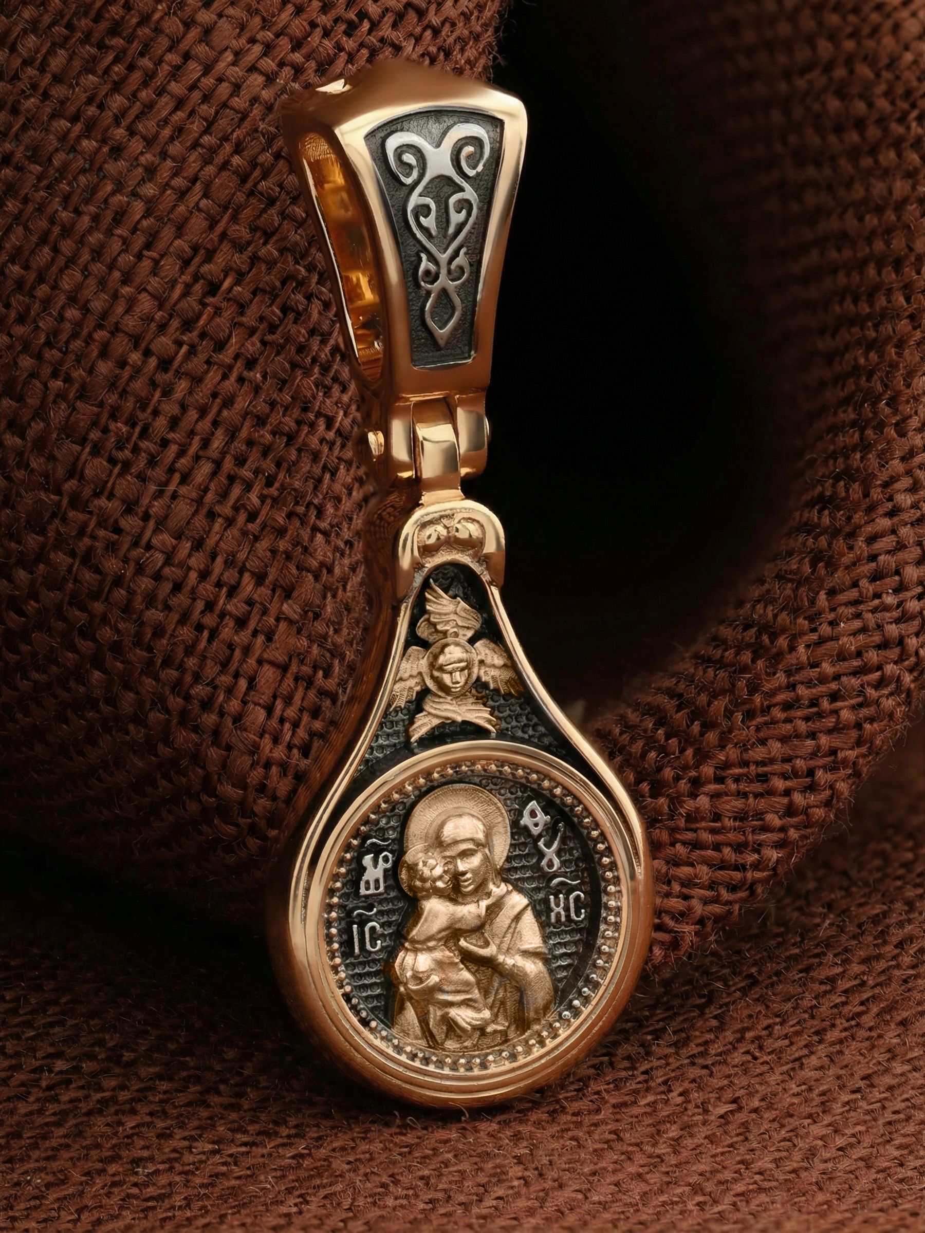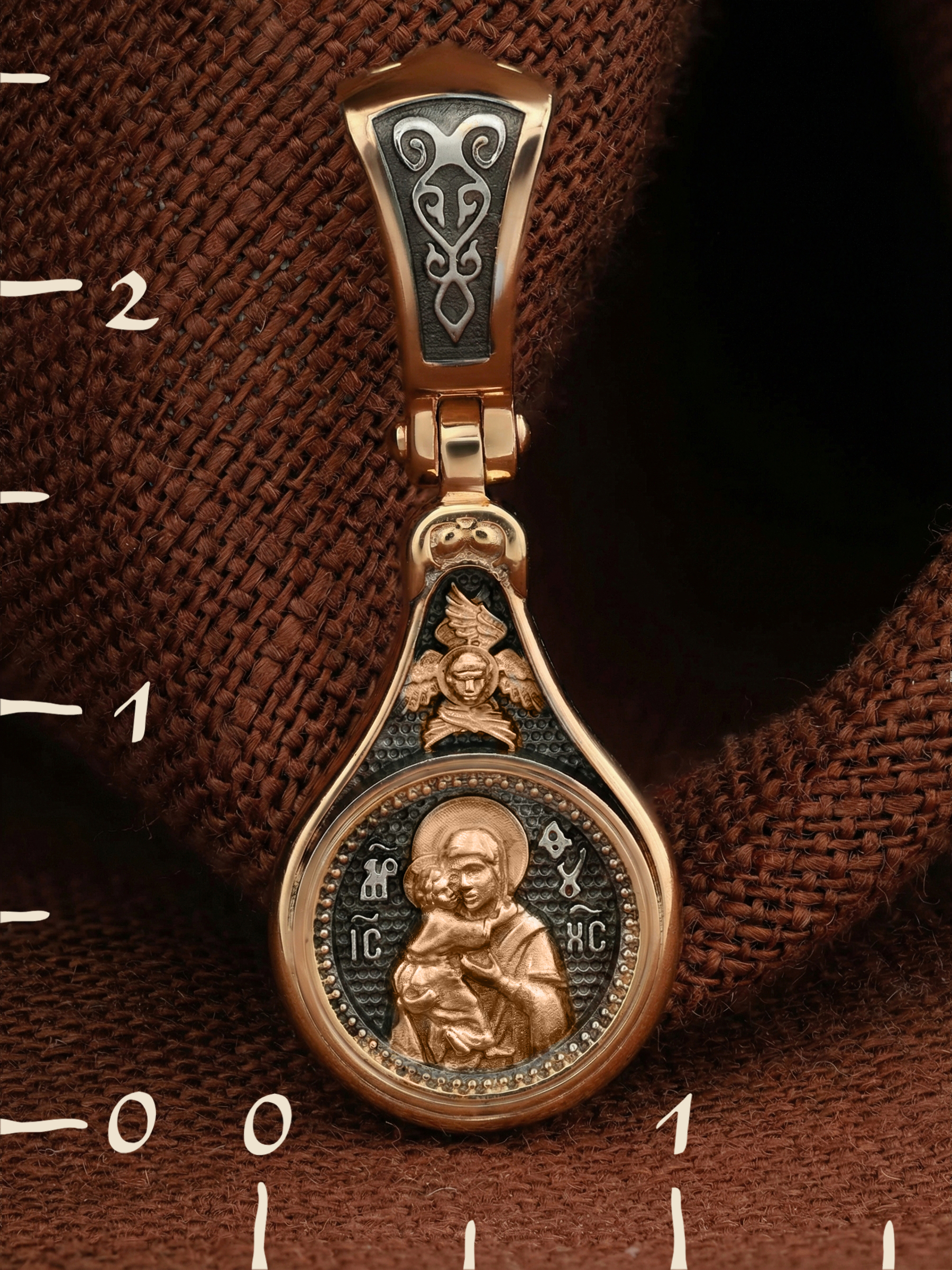 Лицевую сторону образка и кулонное кольцо украшает шестикрылый Серафим — самый приближенный к Господу Ангел.