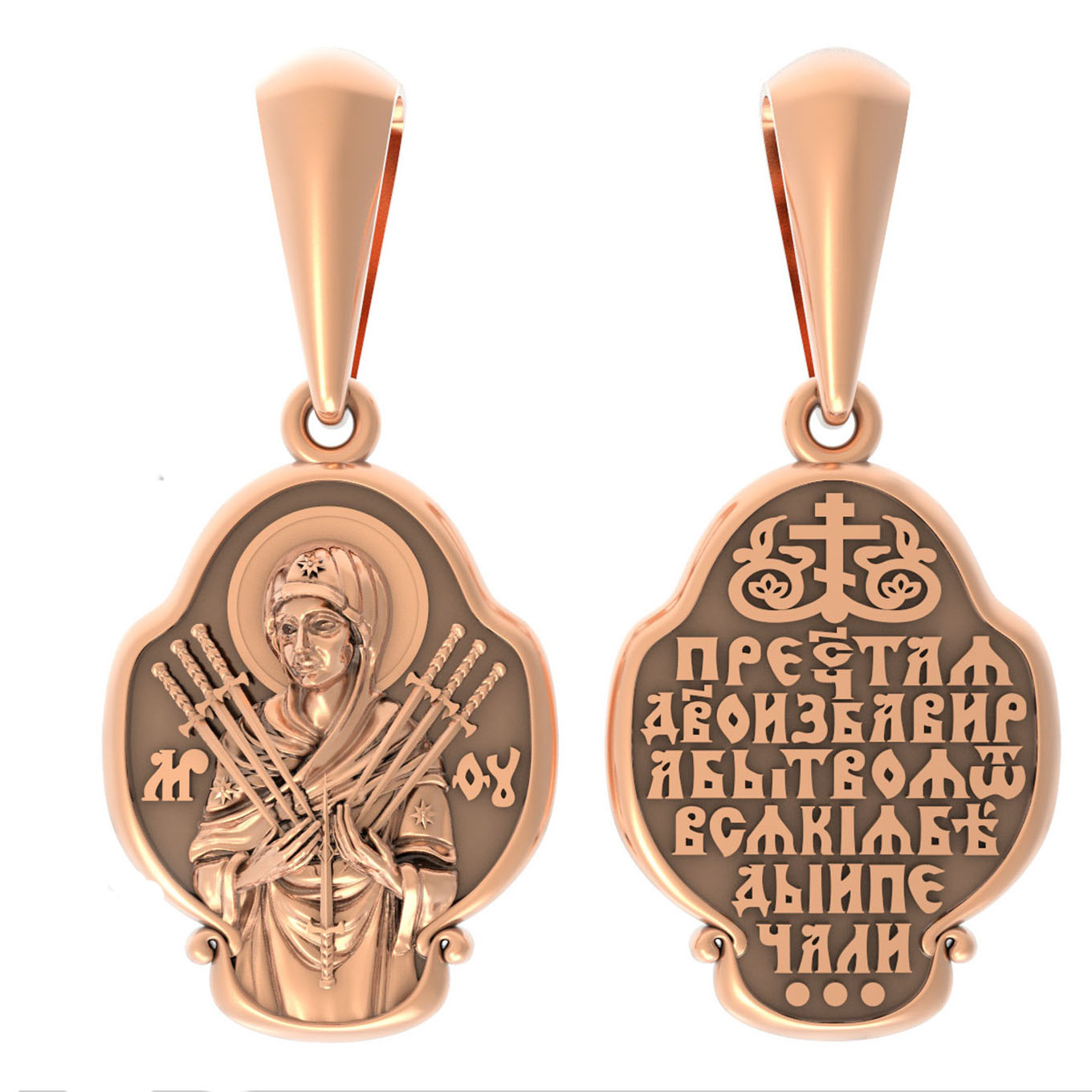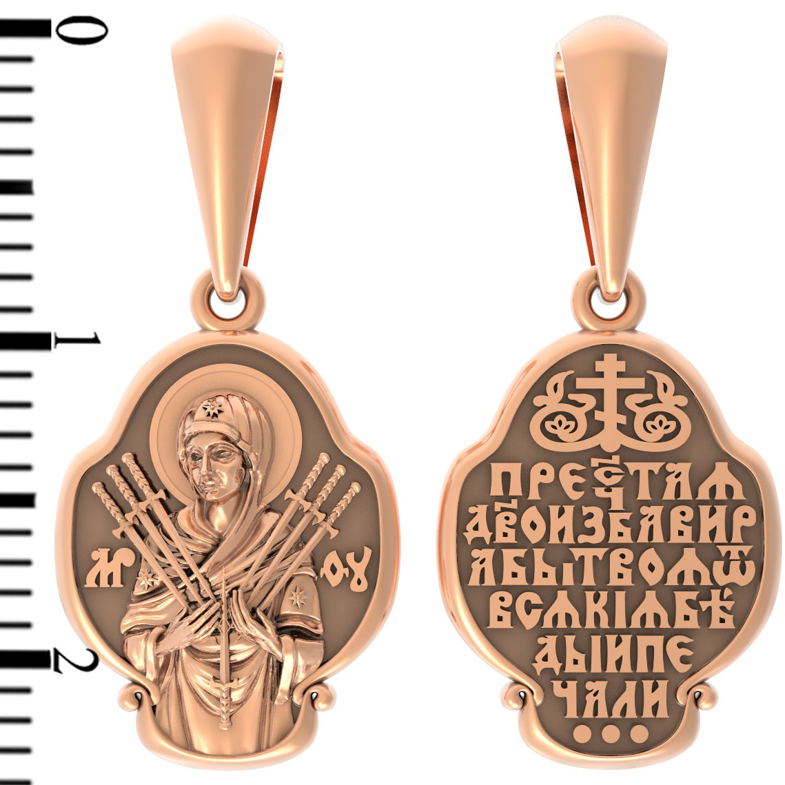 На лицевой стороне образка изображена икона Пресвятой Богородицы «Семистрельная» — одна из самых чудотворных икон на Руси. На протяжении многих веков христиане взывали к Царице Небесной через эту икону, если в стране начинались войны или мятежи.
