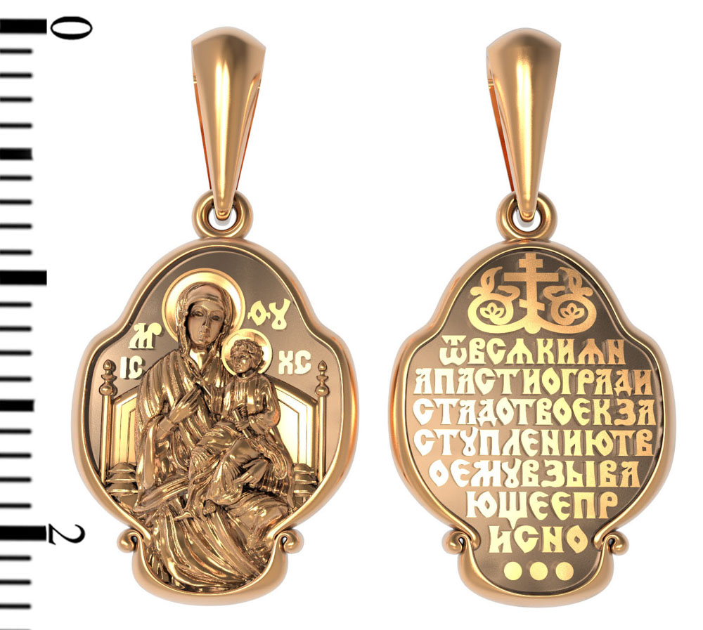 На обороте образка написана молитва Богородице в честь Ее иконы «Всецарица» (Пантанасса): «От всякия напасти огради стадо Твое, к заступлению Твоему взывающее присно».