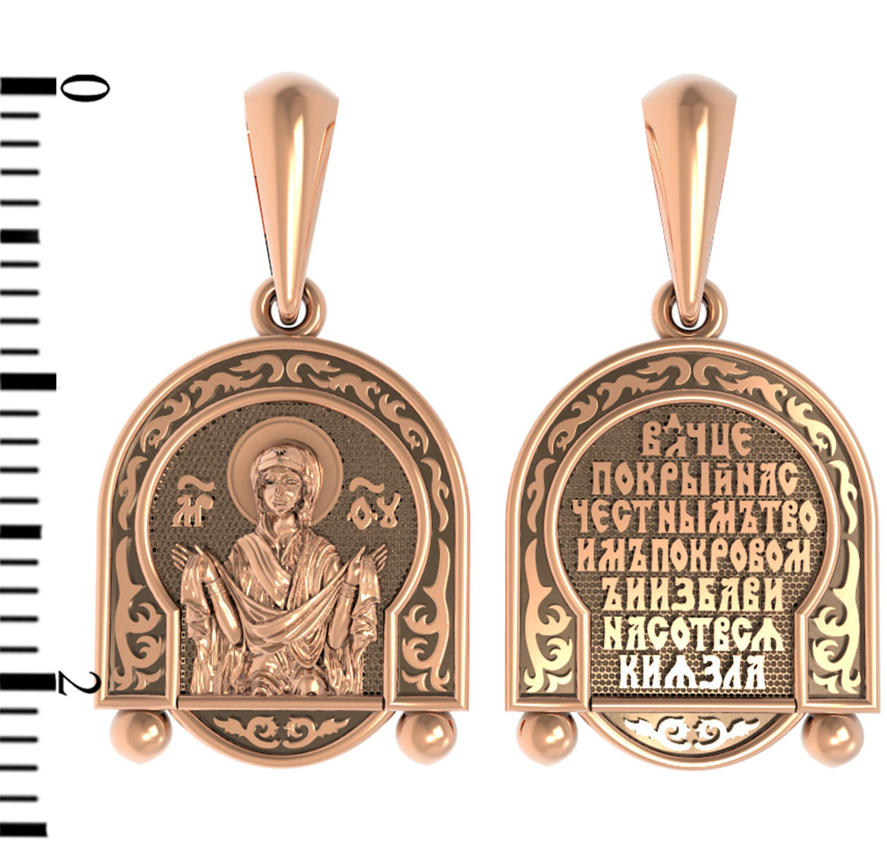 На лицевой части образка изображена икона Покров Пресвятой Богородицы. Праздник Покрова Божией Матери является воспоминанием чуда, которое произошло во Влахнернской церкви 1 (14) октября 910 года: Пресвятая Богородица явилась верующим над алтарем храма и распростерла над ними Свое покрывало. В этот день Божья Матерь открыла людям, что Она является Ходатаицей за них перед Богом. Богородица простирает Свой молитвенный покров над всеми православными христианами и умоляет Сына Своего о даровании вечного спасения каждому человеку.