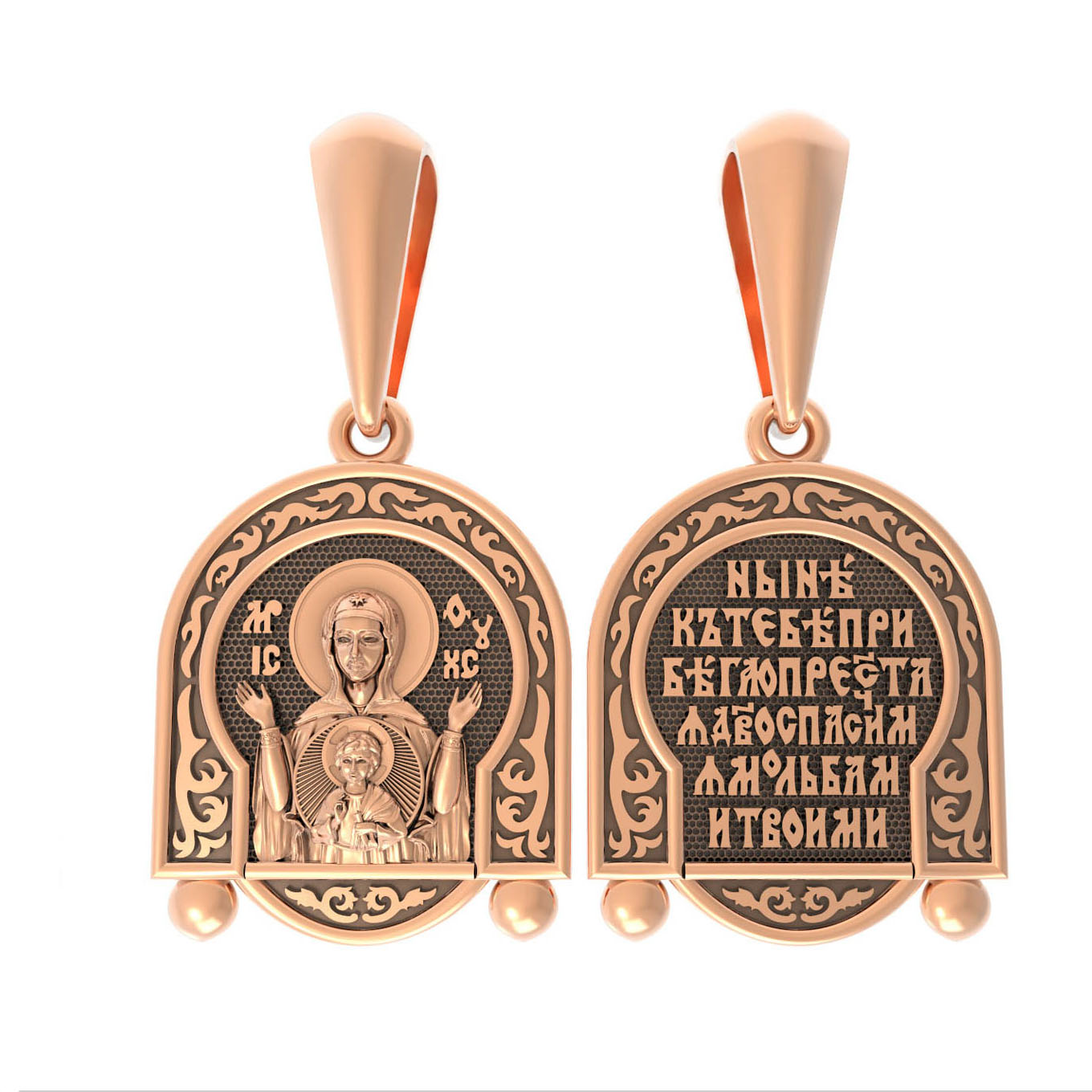 В центр образка помещен образ Божией Матери «Знамение», прославившийся многими чудесами в Новгороде в XII веке. Икона эта чтится как одна из самых великих святынь Русской земли. Молитвенно воздетые руки Богородицы означают заступничество за людей пред Богом. Рядом с Ней, на фоне круглого щита, — благословляющий Божественный Младенец — Спас-Эммануил.